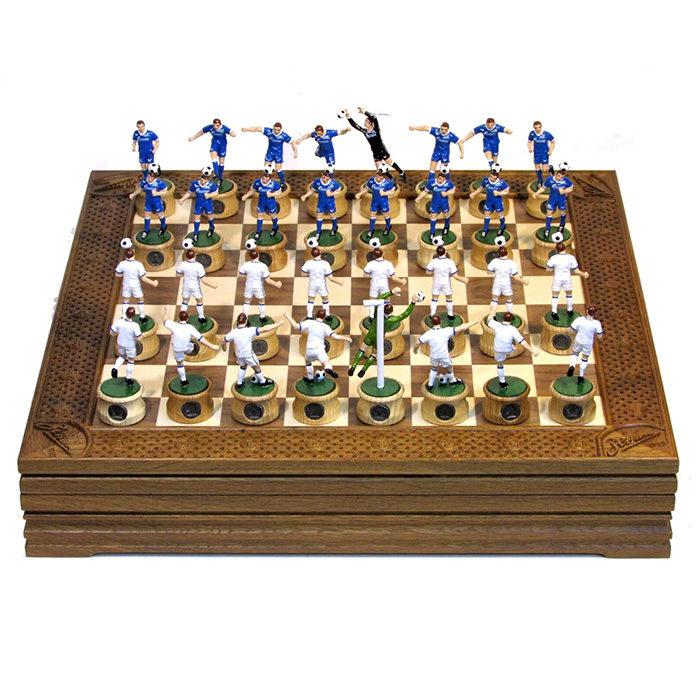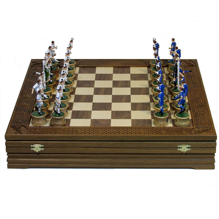 Внутри доски — индивидуальные ячейки из мягкого бархата, заботливо оберегающие каждую миниатюру в пути. Комплект поставляется в транспортной коробке, достойной его класса. Этот набор предназначен для тех, кто с одинаковой страстью любит и футбол, и игру королей, для тех, кто умеет ценить детали, традиции и ручной труд, заключённый в по-настоящему элитный предмет — весомый и ироничный подарок себе или другу, у которого уже есть всё.