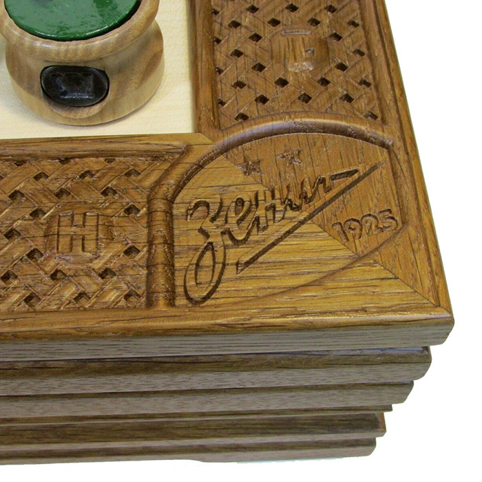 Игровое поле выложено вручную из квадратов шпона клёна и американского ореха, изящно чередующихся в шахматном порядке. Резная доска выполнена из массива черного дуба — мощного, плотного, долговечного. Углы украшают объемные эмблемы клуба, как дань традиции, как знак памяти о великих матчах, пережитых победах и надеждах. Размер клетки — 46,5 миллиметров, размеры доски — 49 на 49 сантиметров. Поле дополнено буквенной и цифровой маркировкой — функциональной и деликатной.