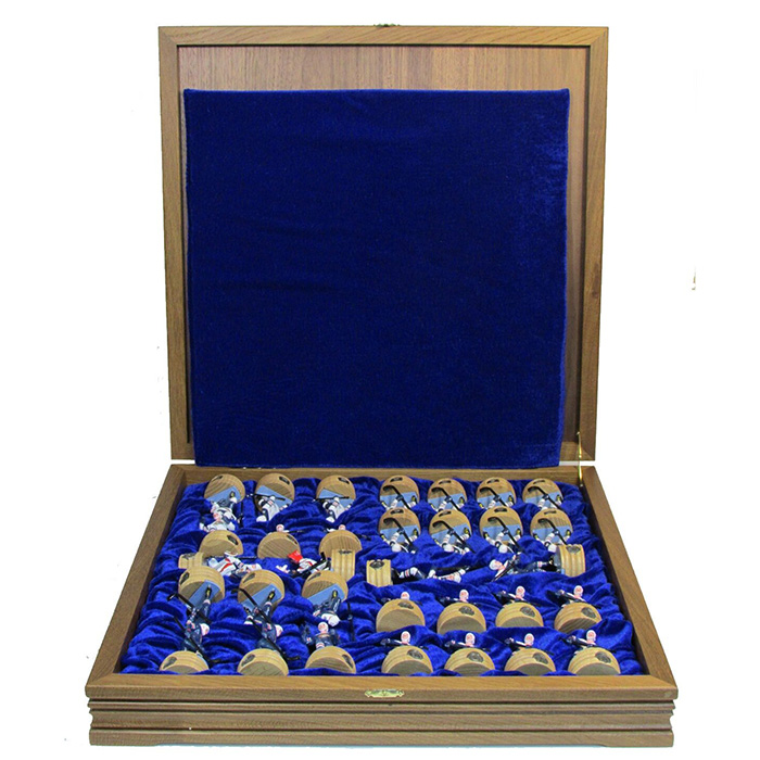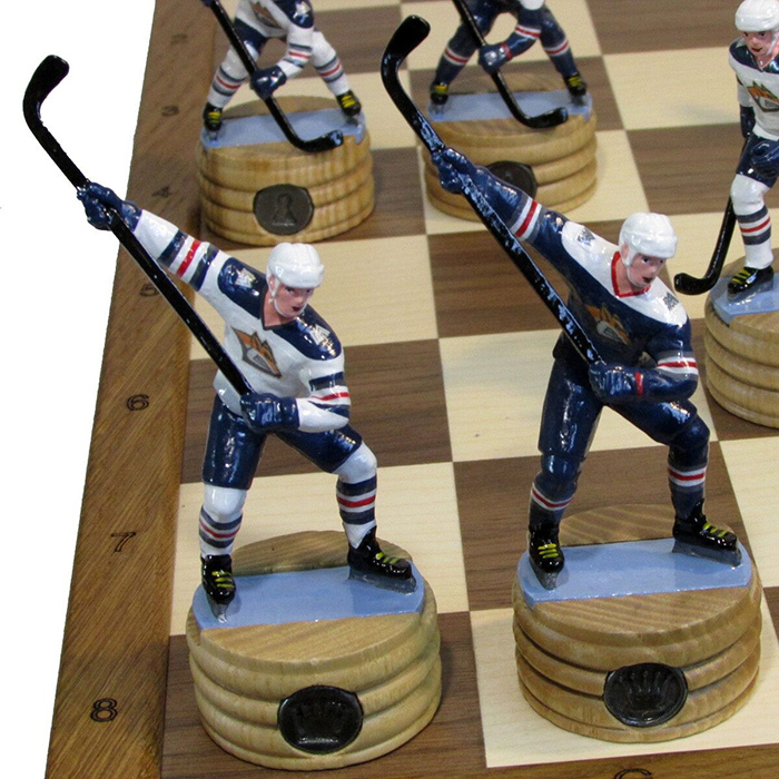 Подставки, изготовленные из редких пород древесины, подчёркивают респектабельность предмета и бережно защищают поверхность доски. Миниатюрные символы, размещённые по обеим сторонам каждого основания, позволяют с лёгкостью определить принадлежность фигур к шахматным ролям. Лаконичные эмблемы заменяют надписи, формируя изящную визуальную систему навигации. Каждая деталь продумана с педантичной точностью: от изгиба хоккейной клюшки до индивидуальной бархатной ячейки, оберегающей фигуру в закрытом состоянии.