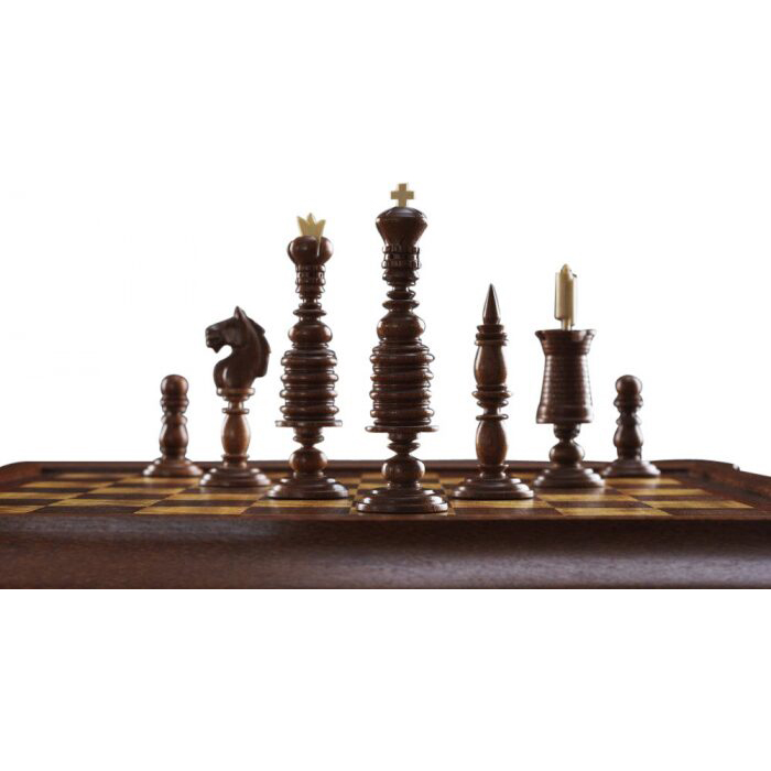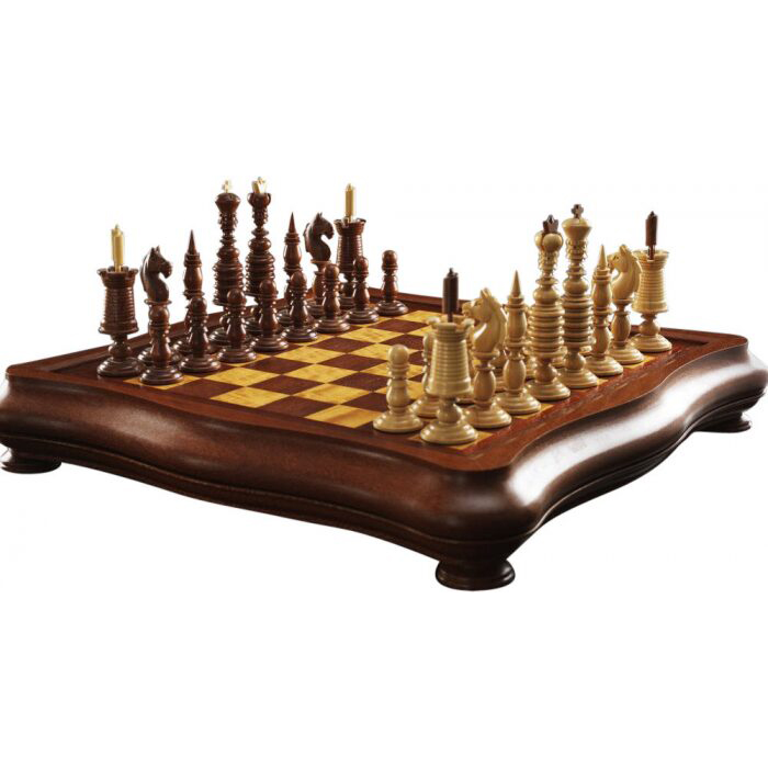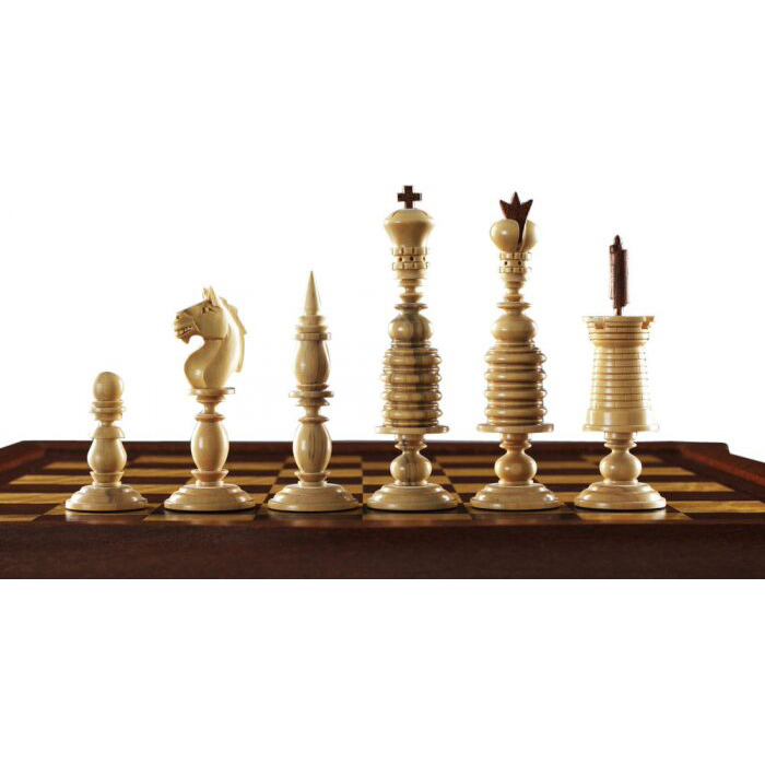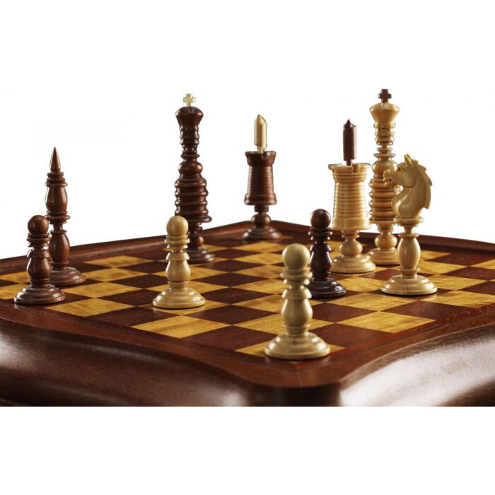 Материалы:фигуры светлые - клен, матовый лак; фигуры темные - красное дерево, матовый лак; основания подклеены замшей. Шахматное поле - матовый лак; клетка светлая - клен; клетка темная - сапеле; корпус - массив красного дерева; ножки доски подклеены тканью.