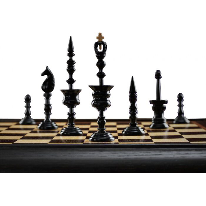 Материалы:фигуры светлые - клен, матовый лак; фигуры темные - клен тонированный, матовый лак; все с утяжелением, основания подклеены замшей. Шахматное поле - матовый лак; клетка светлая - клен; клетка темная - венге; корпус - массив ясень тонировка.