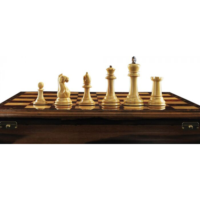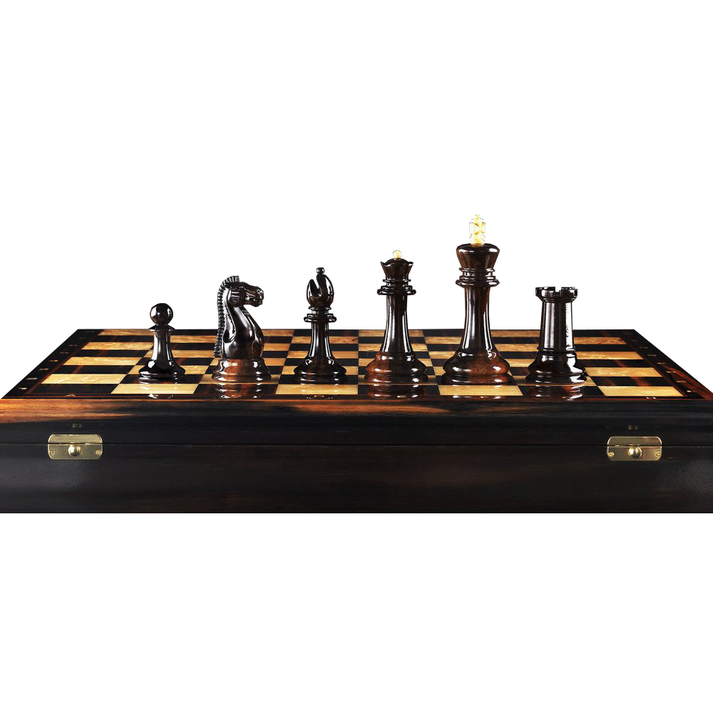 Этот шахматный ларец — воплощение благородства и традиций английской школы, выраженное в совершенных пропорциях классического стиля Стаунтон. Фигуры точёны вручную с филигранной аккуратностью: каждая форма уравновешена, каждый силуэт унаследован от легендарных образцов XIX века. На вершинах королей сияют короны из серебра и позолоты — лаконичные акценты, подчеркивающие не только высокий статус владельца, но и музейный уровень исполнения. Пропорции ладей, изящная резьба на конях, вытянутые силуэты слонов — всё говорит о том, что этот комплект предназначен для ценителей вневременного совершенства и спокойной силы.