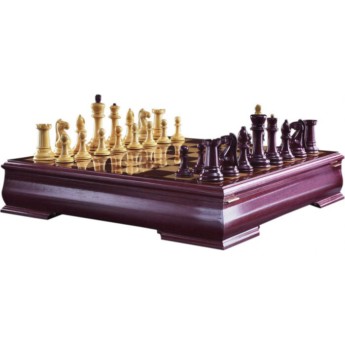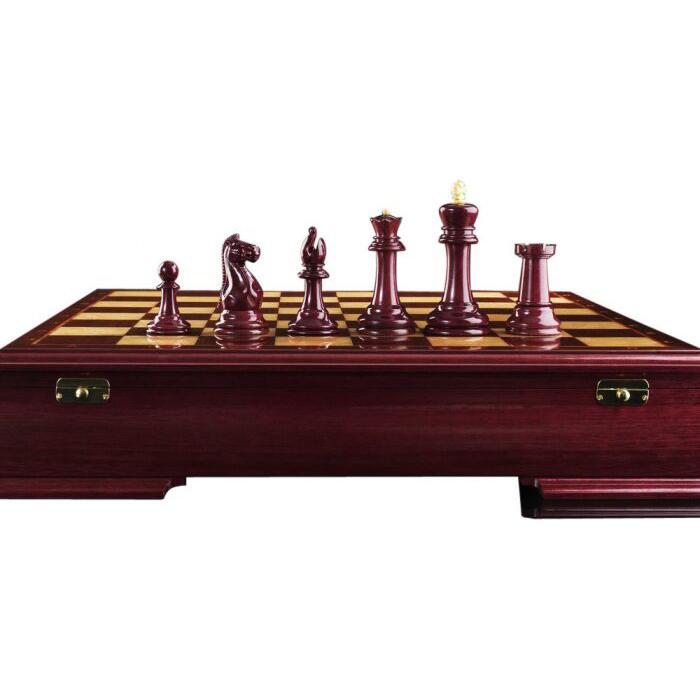Материалы:фигуры светлые - колхидский самшит, глянцевый лак; фигуры темные - амарант, глянцевый лак; все с утяжелением, основания подклеены замшей. Шахматное поле - рояльный лак (полиэфир); клетка светлая - клен птичий глаз; клетка темная - амарант; буквы - корень вишни; корпус - массив южноамериканского амаранта; ножки подклеены замшей. Кейс - тонированной ясень, красное дерево, матовый лак.