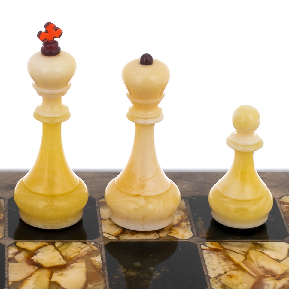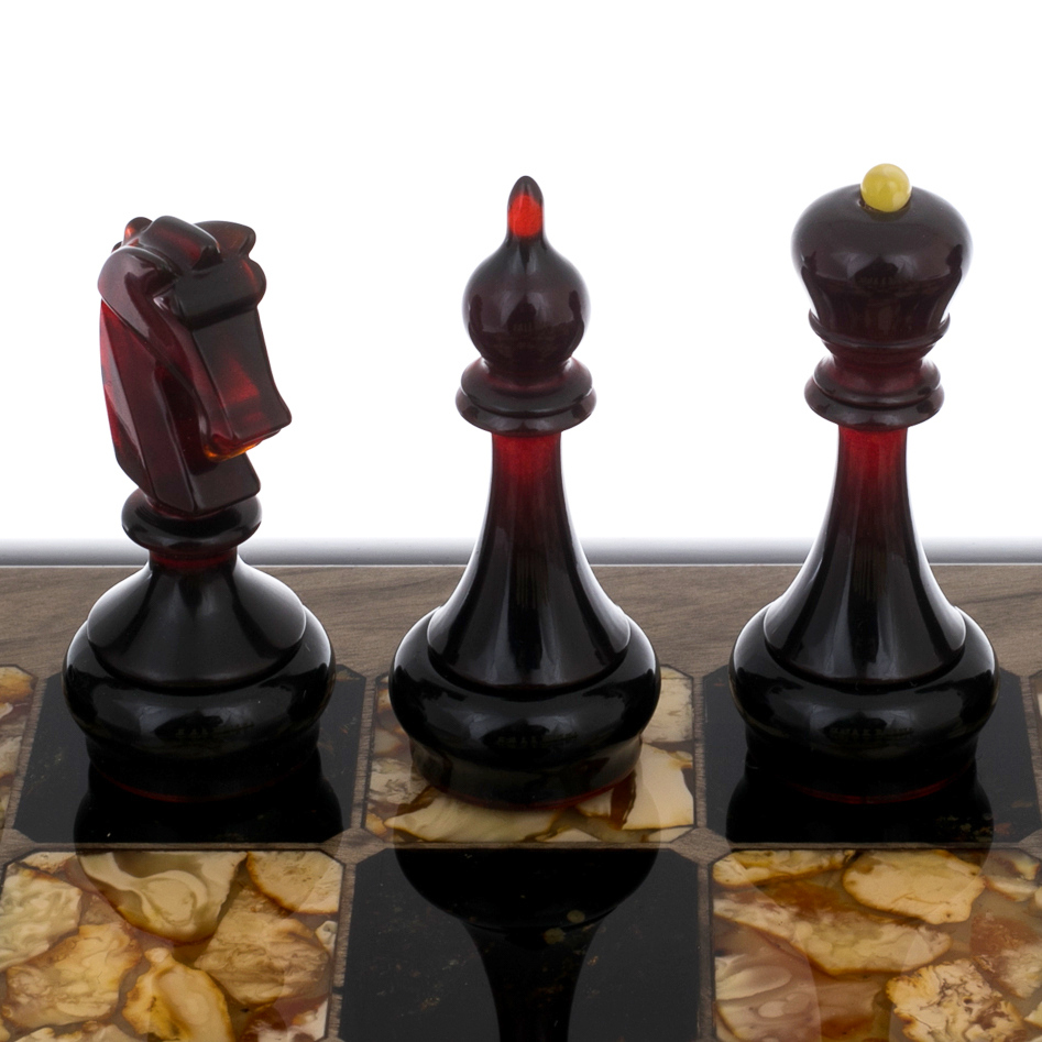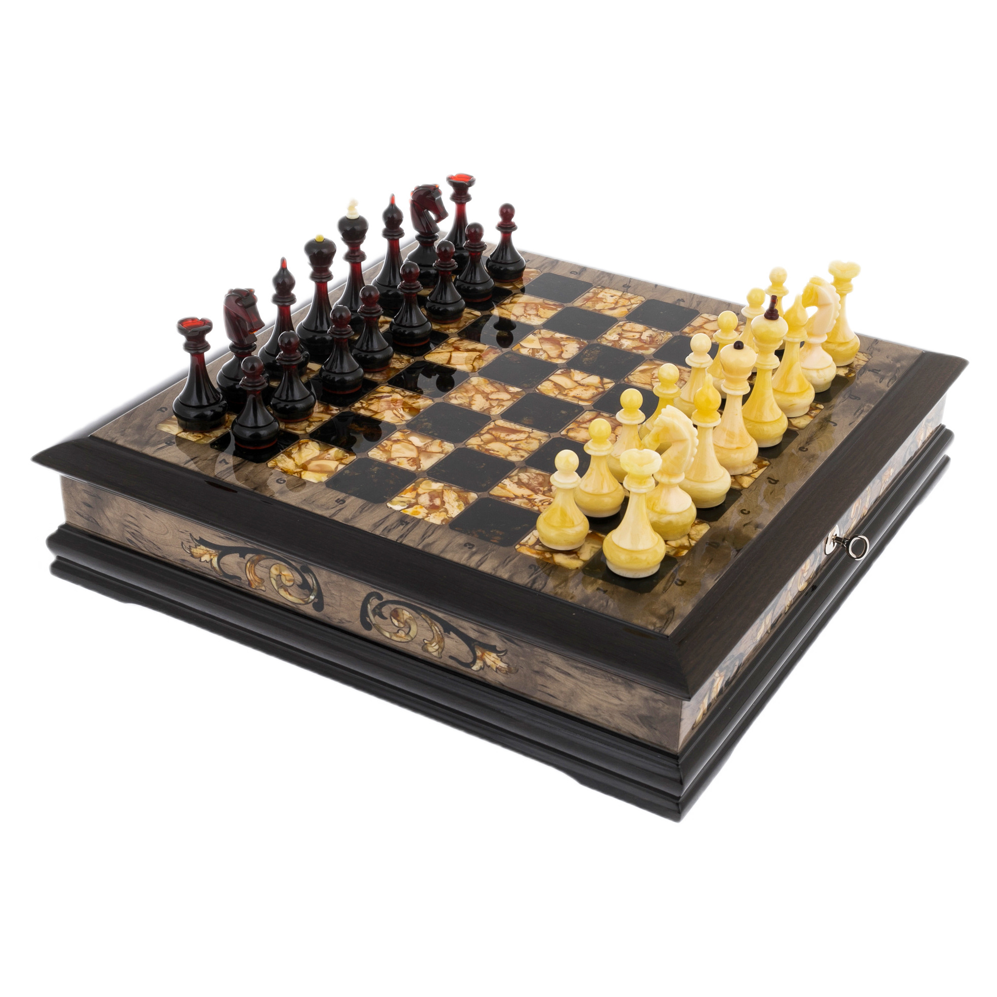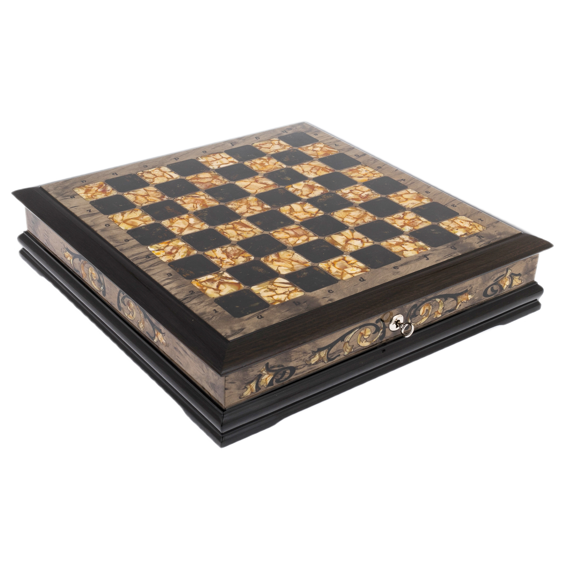 Шахматный ларец из тонированной карельской березы и янтаря "Глаз тигра"