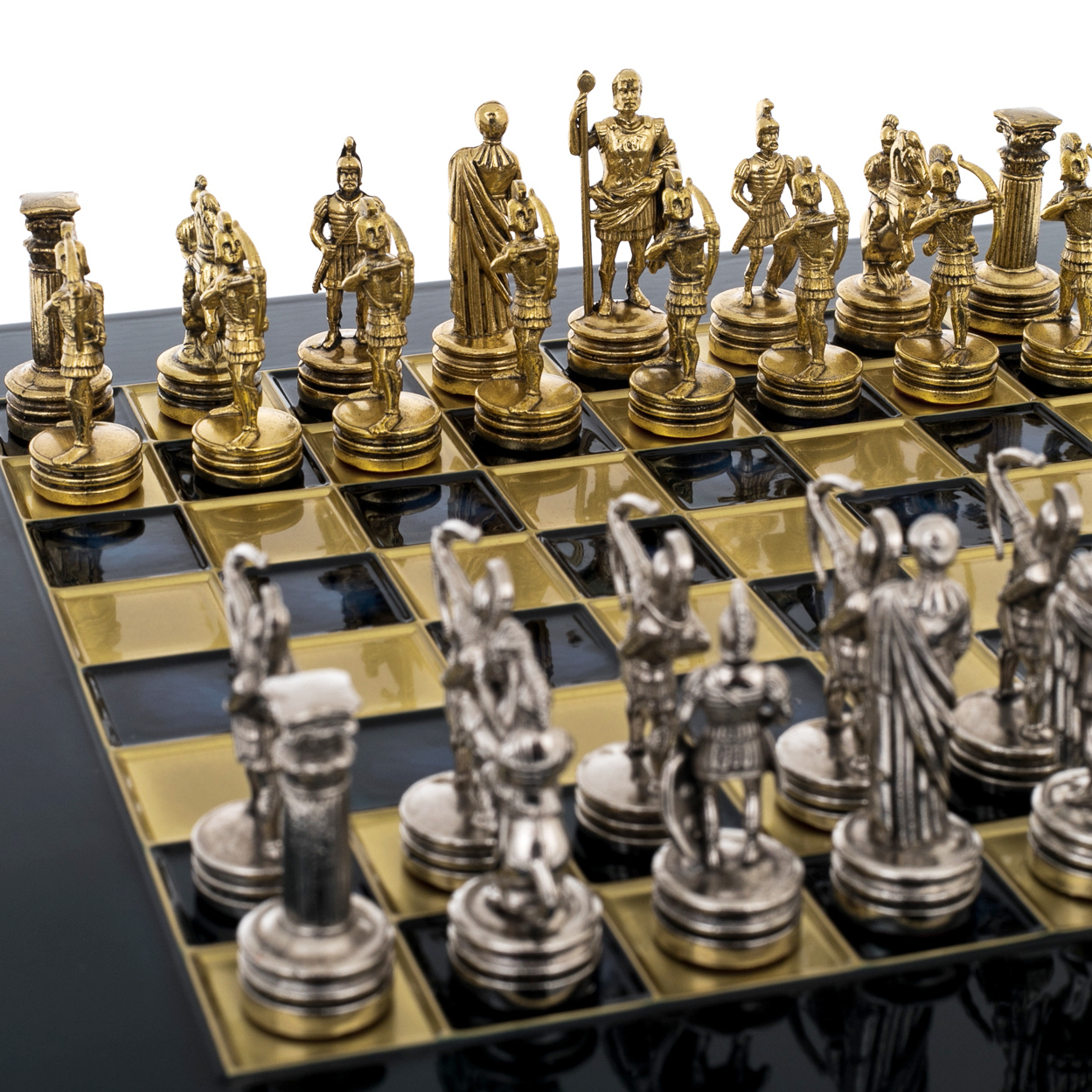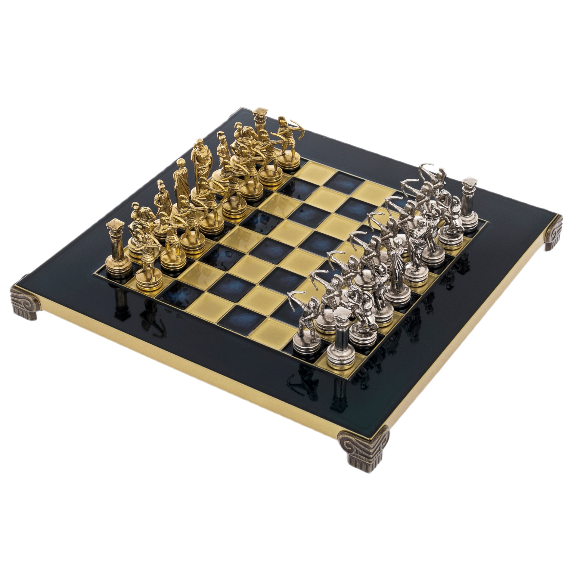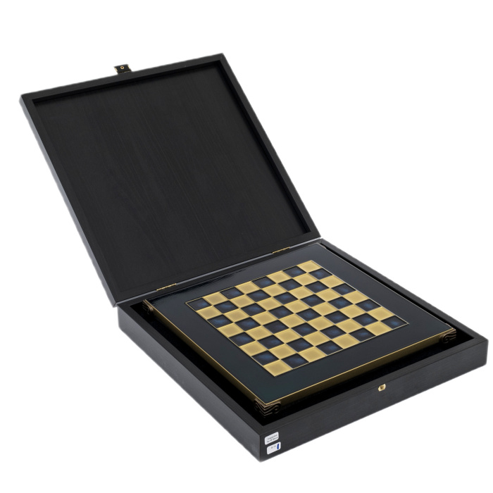 На поле глубокого синего оттенка встречаются армии, созданные мастерами Златоуста из латуни с покрытием золотом и никелем. Каждая фигура — словно оживший герой античных легенд: философы и императоры, воины и лучники, хранители древних тайн и символов силы. Глянцевая поверхность доски отражает их, как гладь времени, связывая прошлое с настоящим.