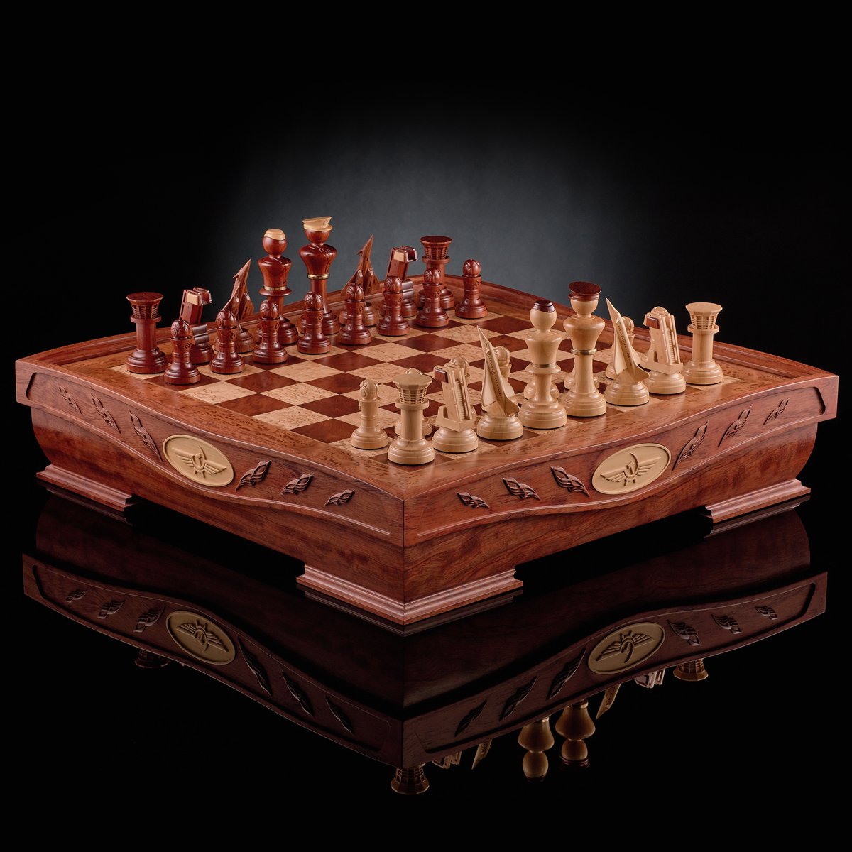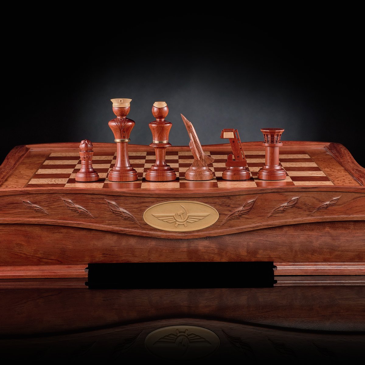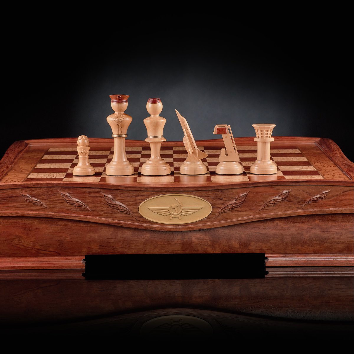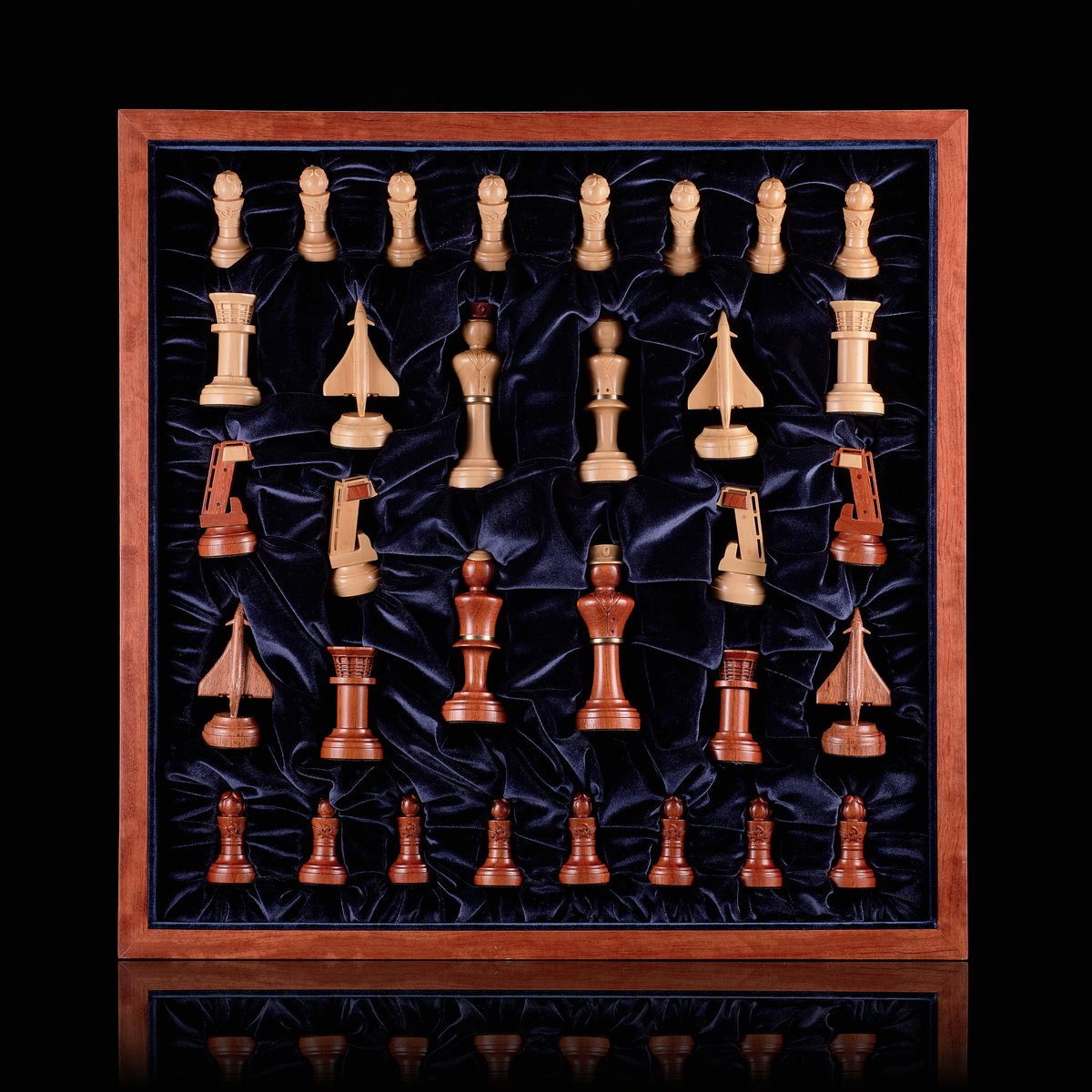 Фигуры — подлинный полёт фантазии мастера, не имеющий аналогов. Пешки — обтекаемые и строгие, ладьи и ферзи — словно командные башни и радары, кони воплощены в форме скоростных истребителей, а слоны приобрели очертания штурмовой авиации. Короли и королевы выполнены с налётом аристократичности, венчающей этот строй. Благодаря балансировке и утяжелению, каждая фигура уверенно ложится в руку, подчёркивая тактильную эстетику и инженерную выверенность. Светлая партия выполнена из светлого клёна, тёмная — из благородной породы с тёплым кирпичным оттенком.