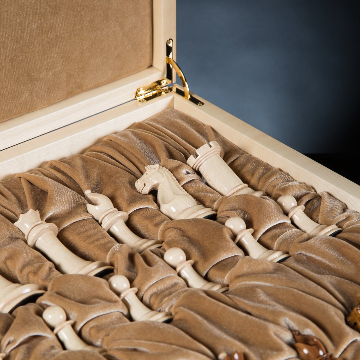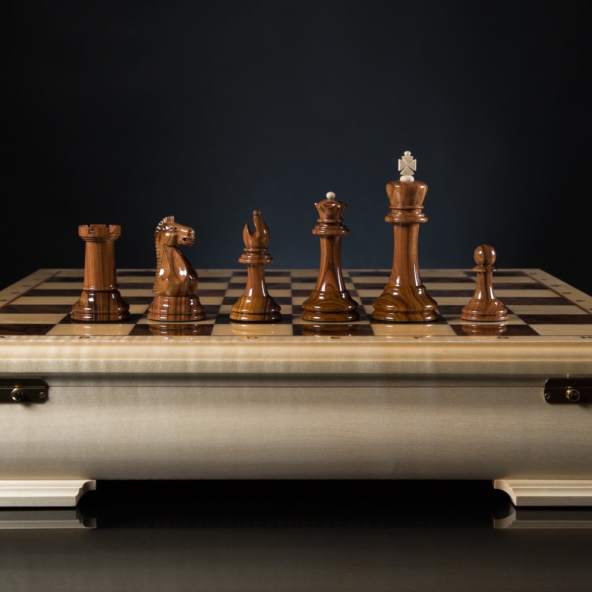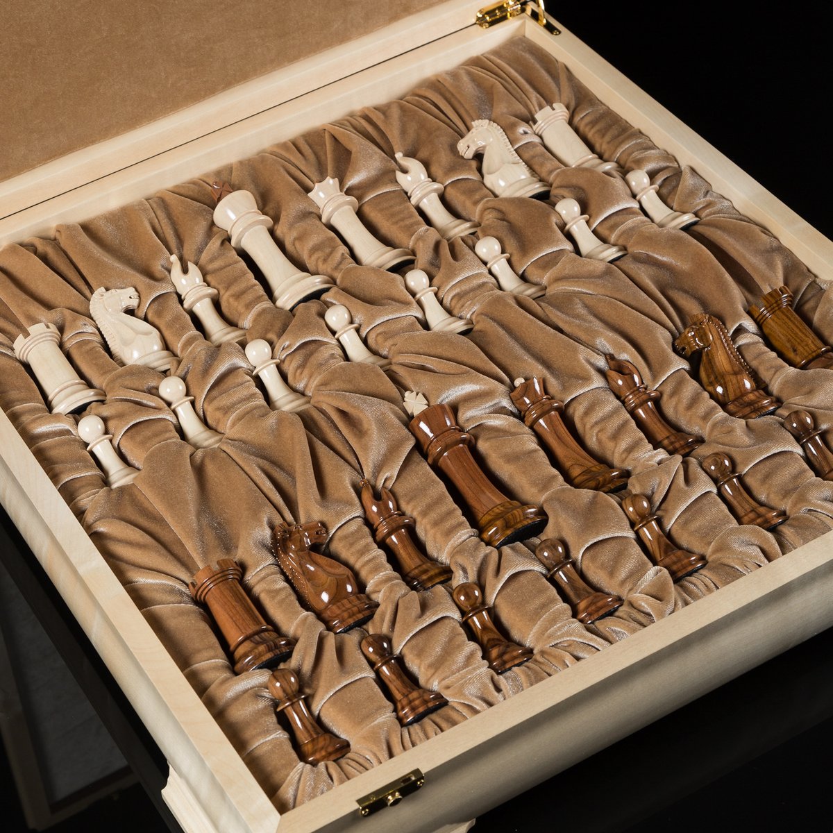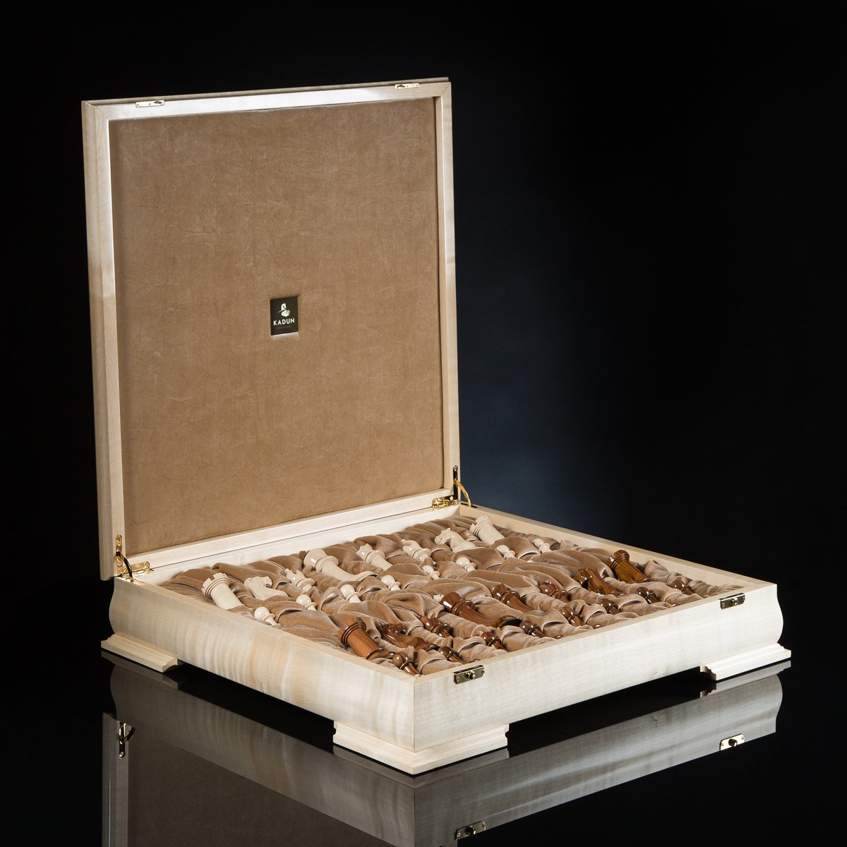 Шахматный ларец Staunton Luxe — изысканный артефакт, рожденный в мастерской KADUN. Игра скрыта в облике произведения искусства, где каждая фигура выточена вручную из отборного клена сикамора и полисандра, пород, веками окруженных ореолом исключительности. Их тёплая текстура, благородный блеск, плавные очертания создают хоровод форм, в котором воплощается сила, стратегия и достоинство. На крышке ларца — лаковая шахматная доска, инкрустированная тончайшими плитками шпона, глянцевая поверхность которой отражает фигуры словно зеркало размышлений.