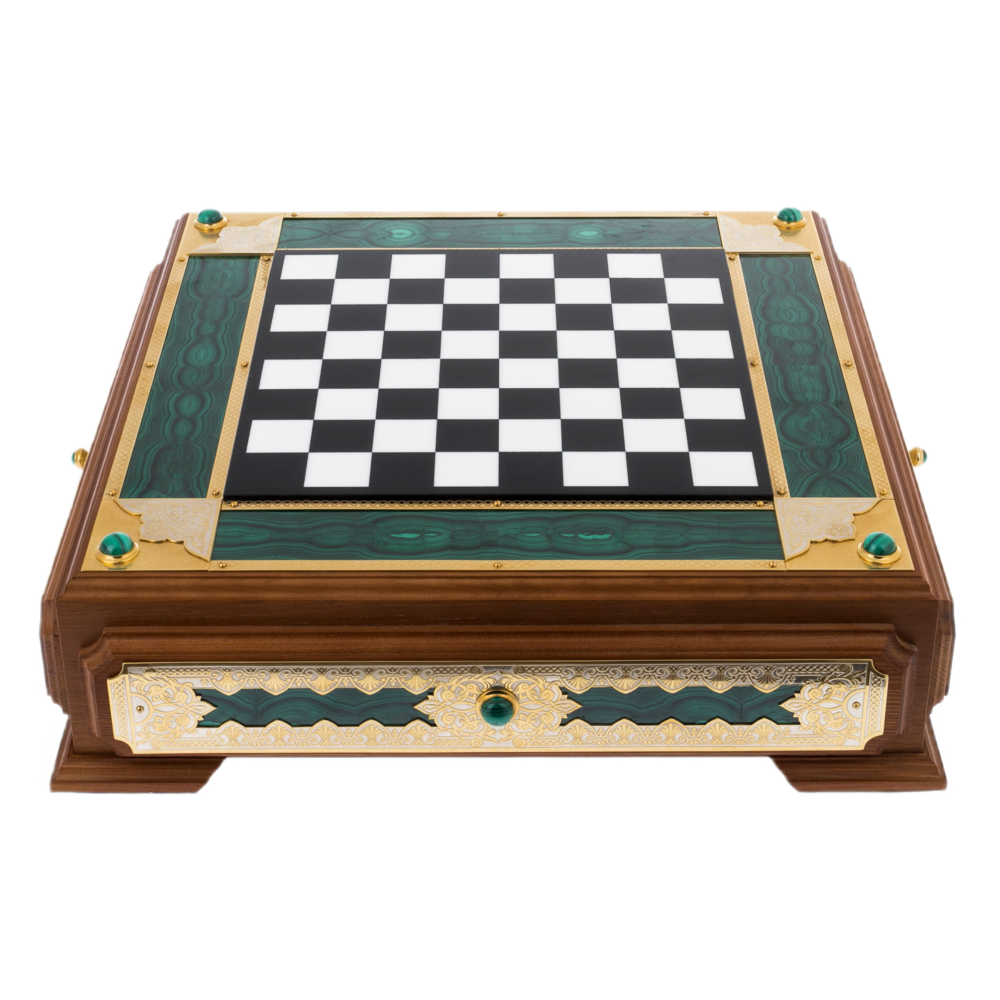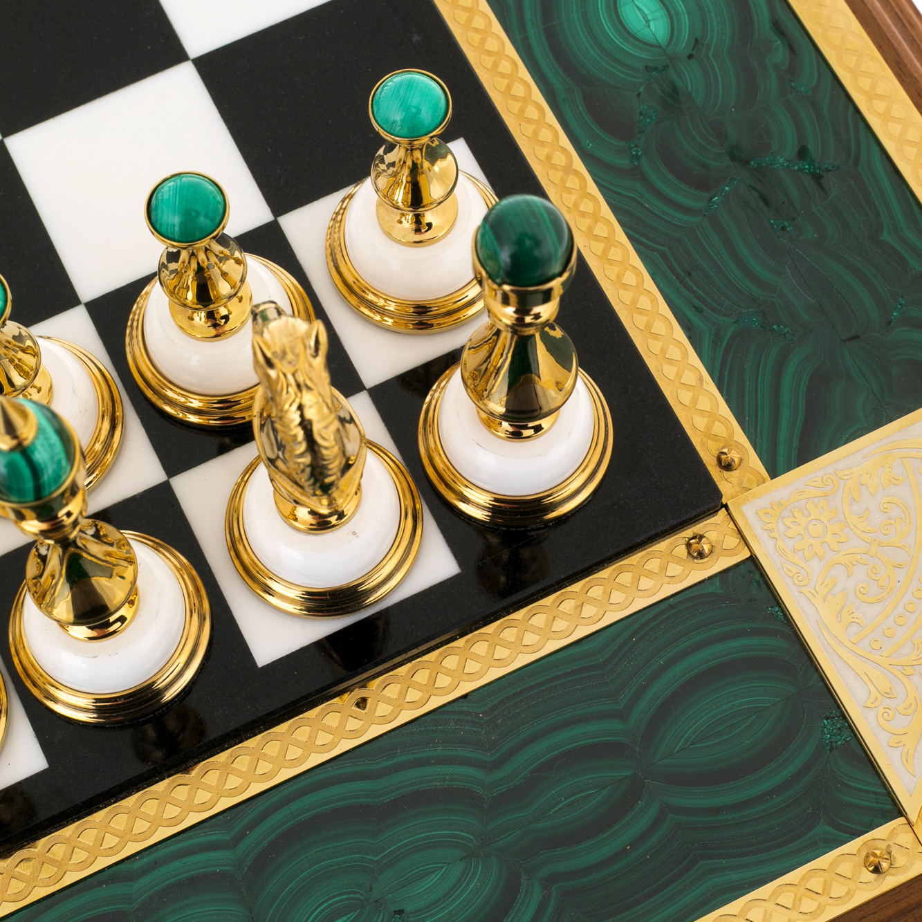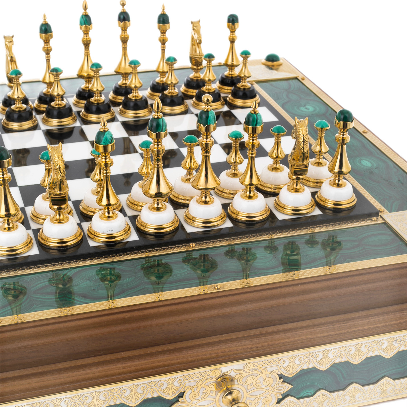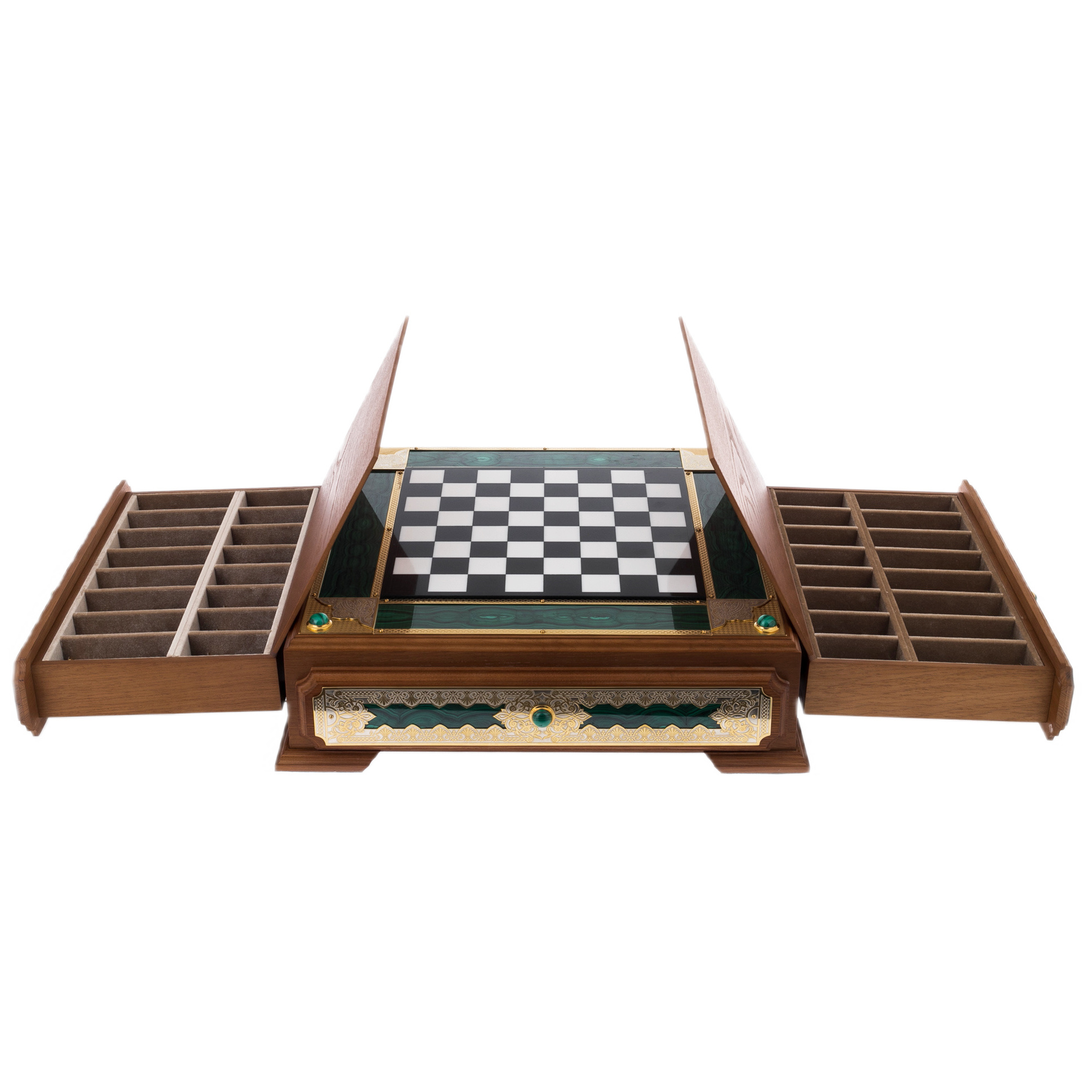 Материалы:малахит, латунь, бронза, бархат, орех, никель, позолота.