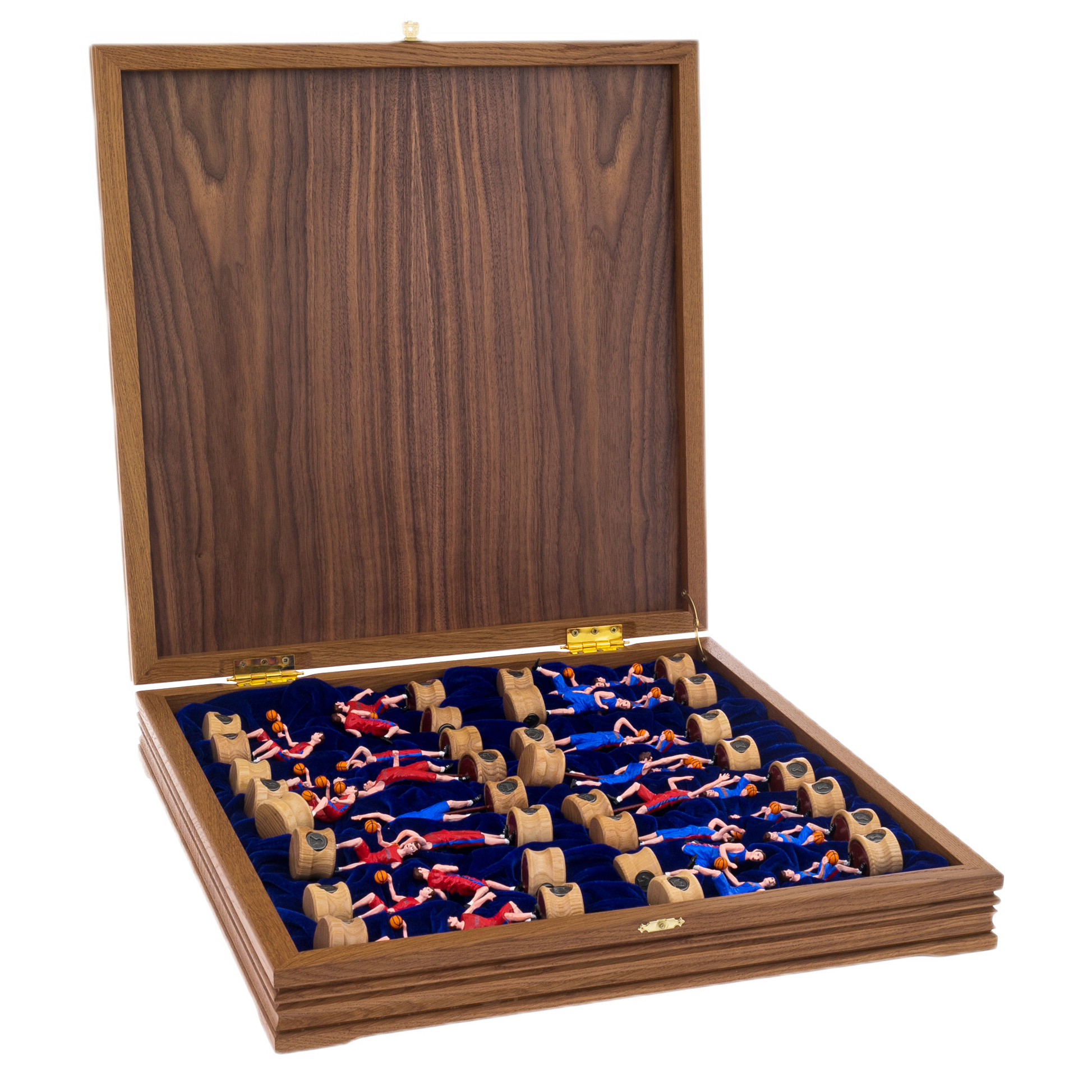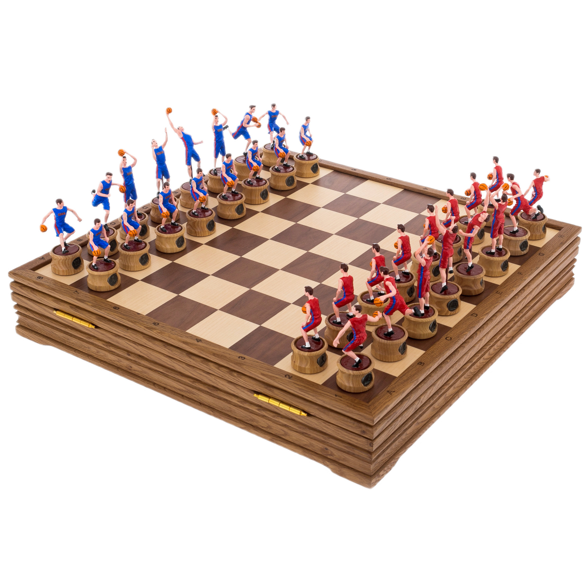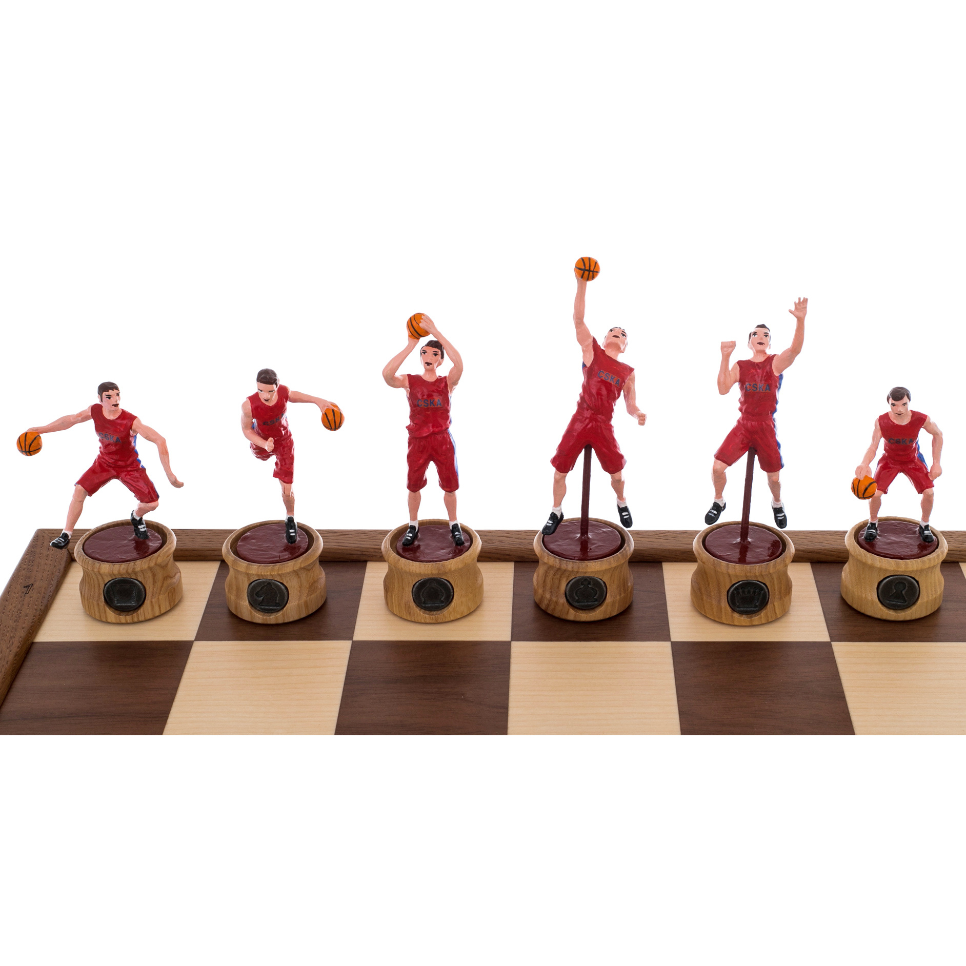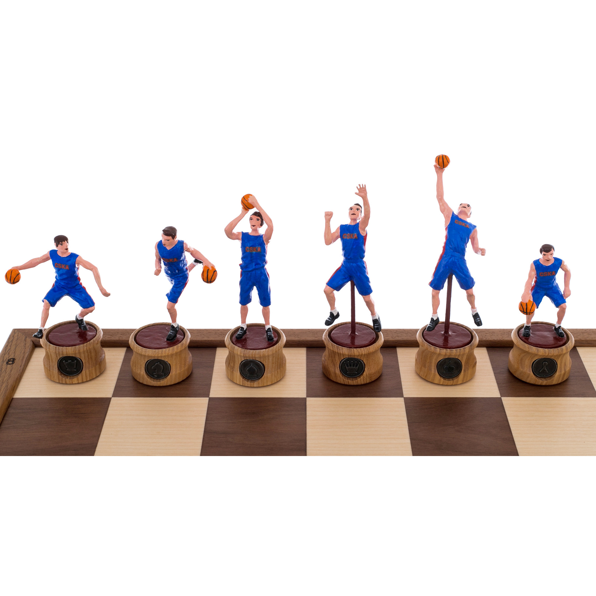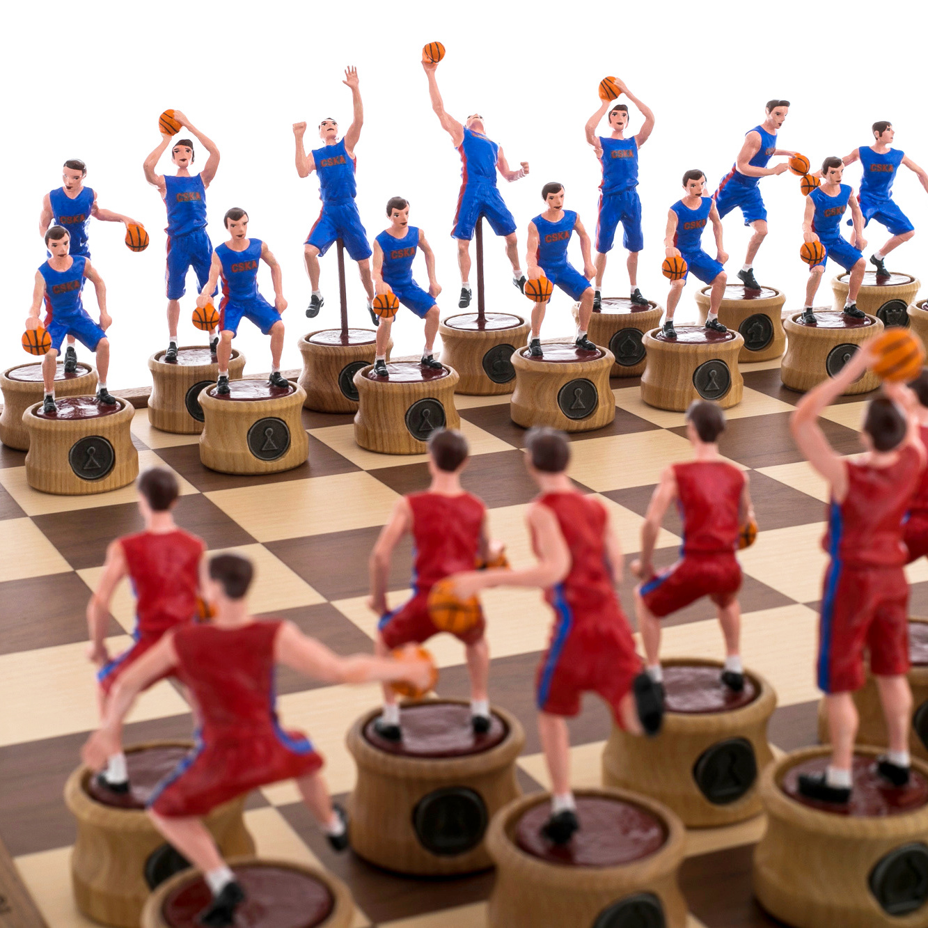 Шахматы "Баскетбол — ЦСКА" — это не просто игра, это воплощение спортивной энергии и величия. Каждая фигура — это маленькая скульптура, динамично запечатлевшая момент игры в баскетбол. Игроки в красной и синей форме (традиционные цвета ЦСКА) символизируют противостояние, азарт и командный дух, царящие на спортивной арене. Они выполнены с удивительной точностью, каждая фигура захватывает дух своим движением — от броска мяча до прыжка. Это настоящие произведения искусства, каждое из которых уникально в своей деталировке и позе, что делает шахматную партию не только интеллектуальной битвой, но и эстетическим наслаждением.