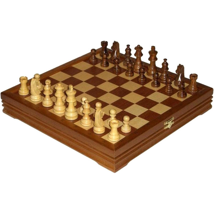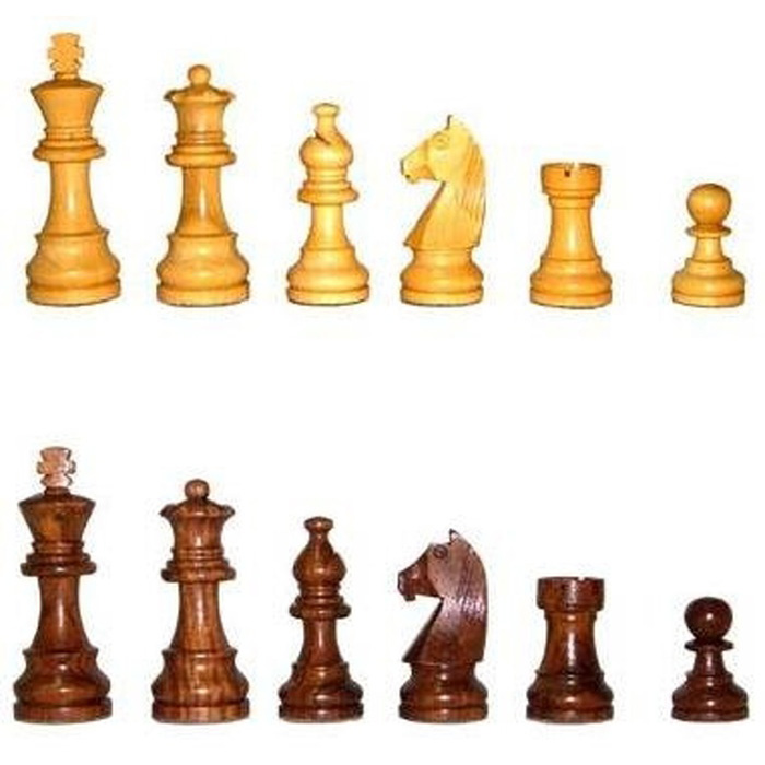 - Фигуры выточены вручную: светлые из самшита, а темные из розового дерева. Высота короля - 2,75 дюйма (около 7 см).