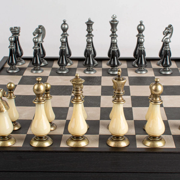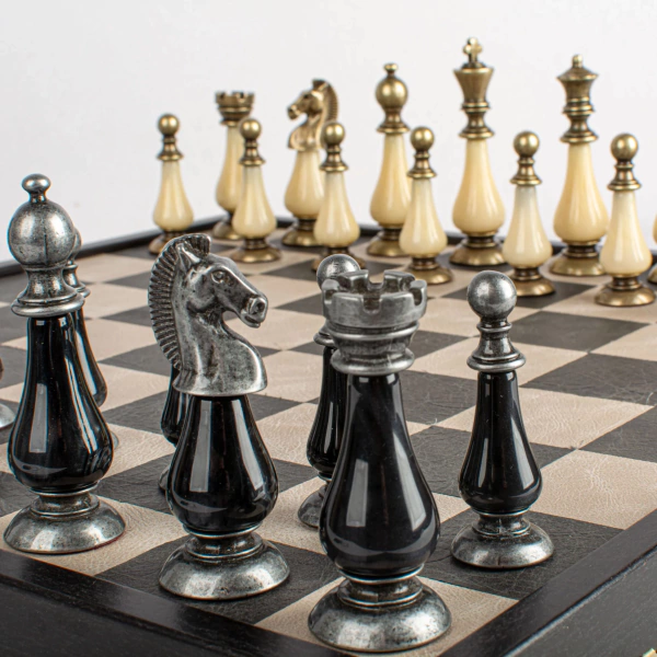 Игровая доска выполнена с использованием кожаных вставок благородных оттенков коричневой и слоновой кости. Такая поверхность придаёт полю мягкую текстуру и глубокий цветовой контраст, благодаря которому каждая партия проходит на особенно выразительном фоне. Деревянный корпус доски отличается строгими линиями и аккуратной отделкой, а фурнитура подчеркивает ощущение завершённого и цельного предмета.