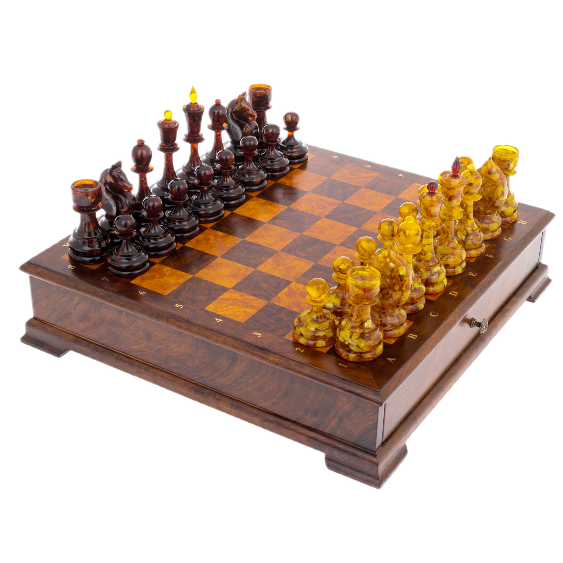 Этот набор станет великолепным подарком для любителей шахмат и коллекционеров, подчёркивая их изысканный вкус и уважение к традициям. Эргономичная форма фигур обеспечивает комфорт во время игры, а удобные выдвижные ящики для хранения позволяют бережно сохранять комплект в идеальном состоянии. Шахматы с янтарными фигурами «Классика» — это не просто игра, а настоящее произведение искусства, которое вдохновляет на стратегические победы и дарит эстетическое наслаждение.