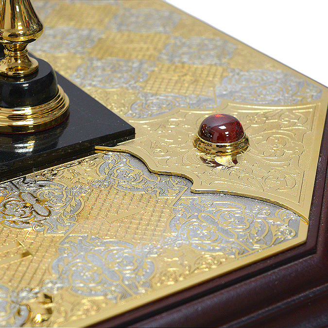 Материалы: бронза, латунь, кахолонг, долерит, ювелирное стекло имитирующее гранаты.