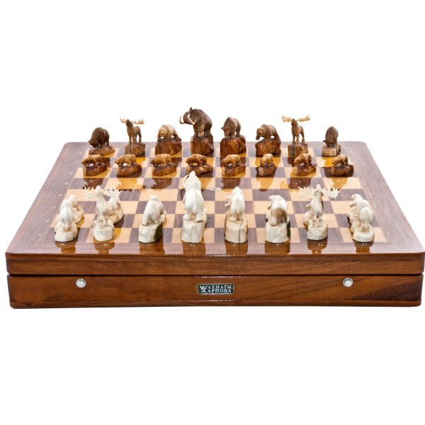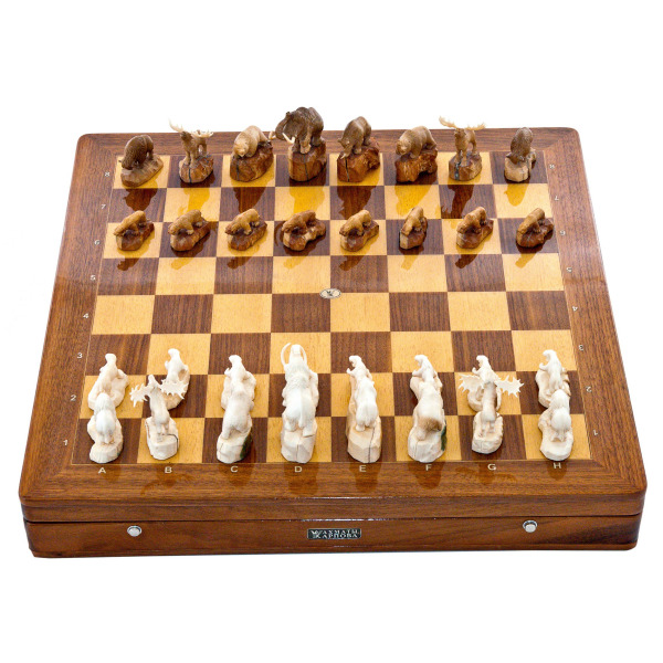 Шахматы из бивня мамонта "Наскальная живопись"Шахматы из бивня мамонта "Наскальная живопись"Этот шахматный набор из бивня мамонта — словно застывшая симфония древности, где каждый элемент воплощает в себе величие тысячелетий. Эти фигуры, рожденные из костей доисторических титанов, переносят нас в мир, где время — не просто течение, а глубокая река, в которой растворены образы и тени исчезнувших миров.