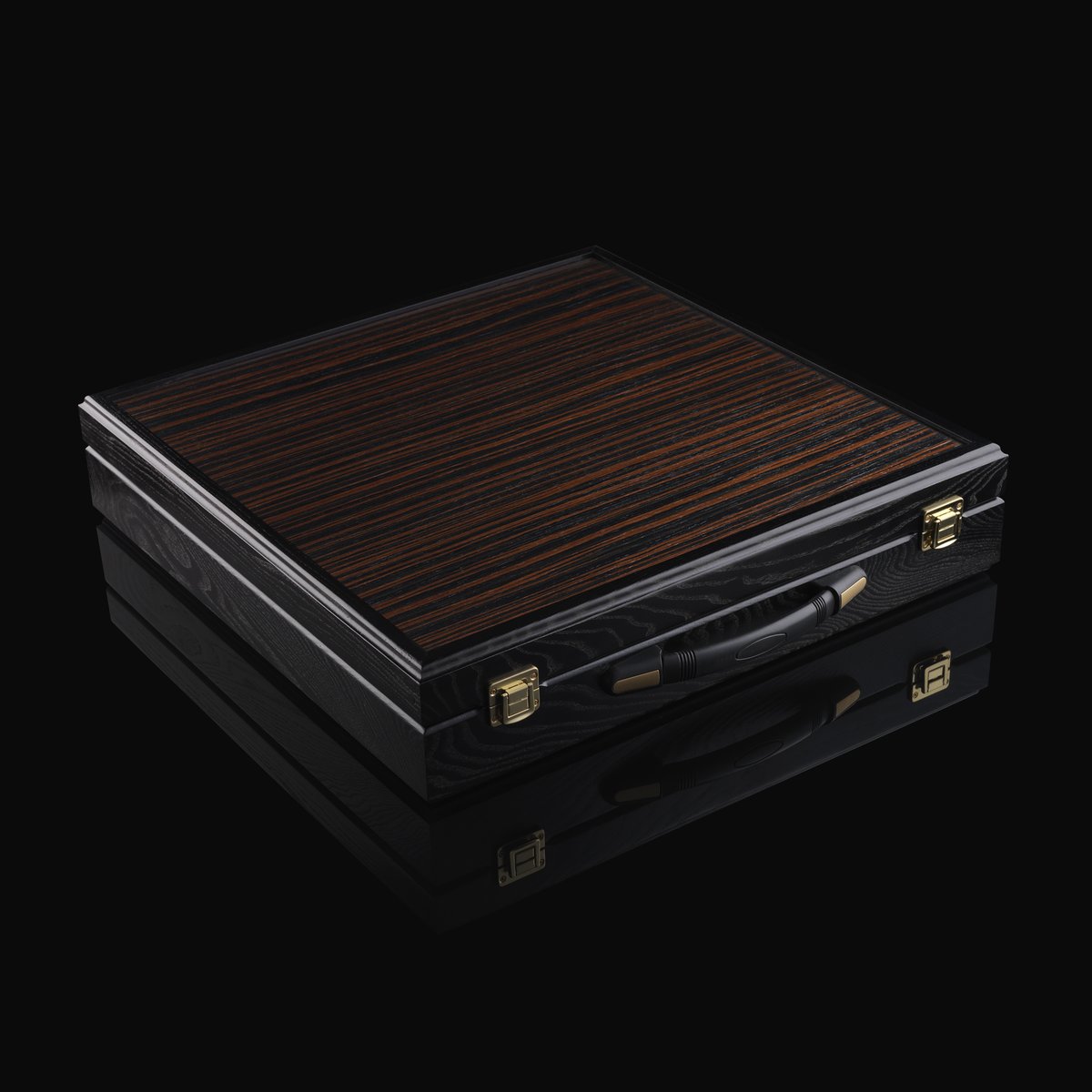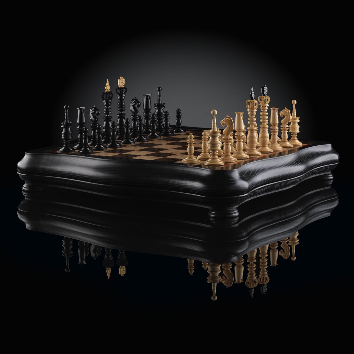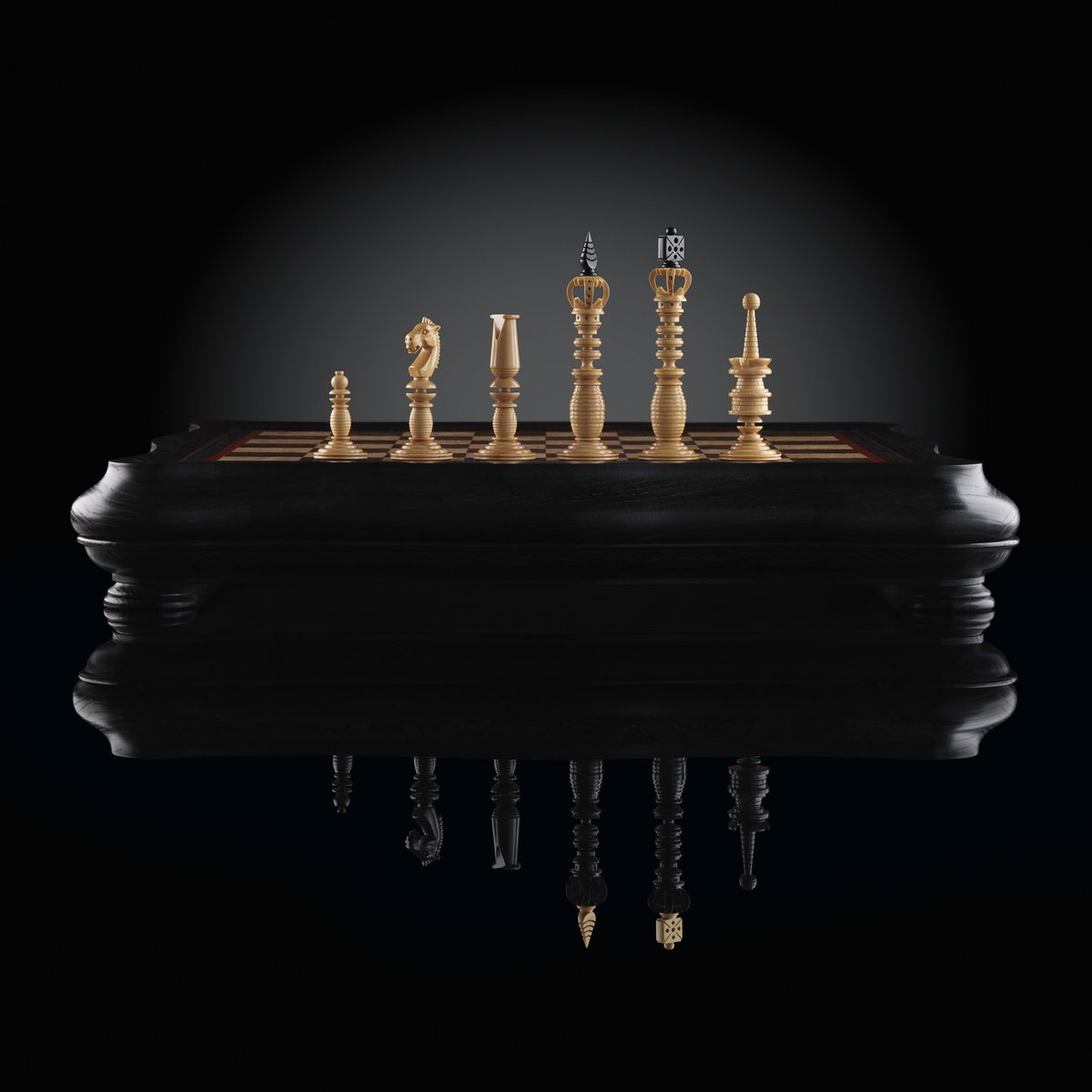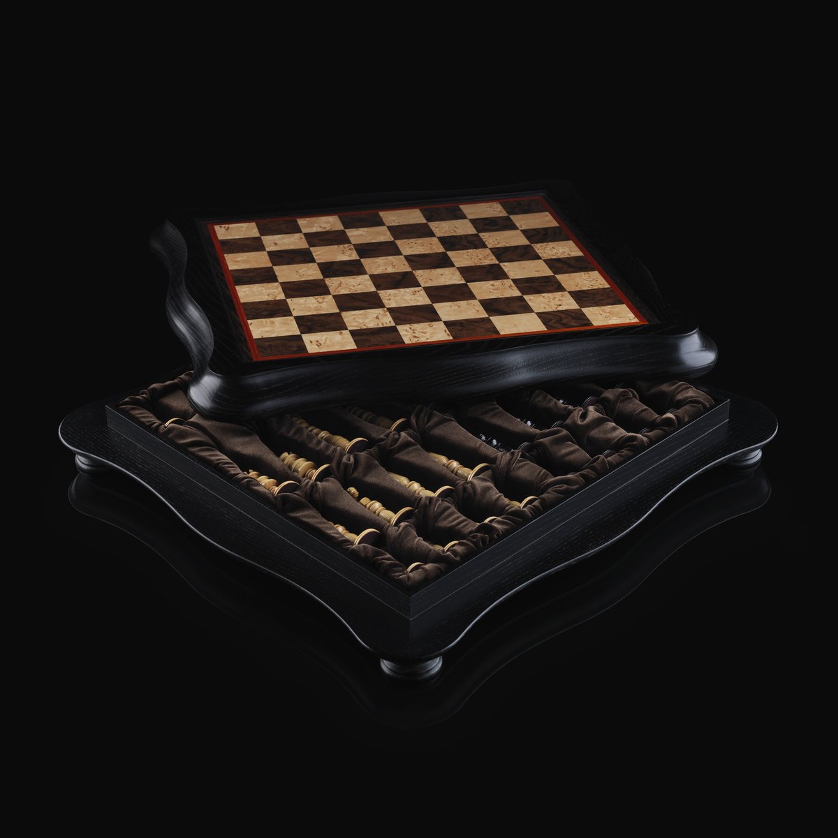 Материалы:фигуры с утяжелением, основания подклеены бархатом, светлые – колхидский самшит, матовый лак, темные - колхидский самшит, тонированный матовый лак; корпус - ясень тонированный, матовый лак; клетки - карельская береза(светлая), корень ореха(темная); конструкция доски со съемной верхней крышкой, в нижней части доски выполнен мягкий бархатный ложемент.