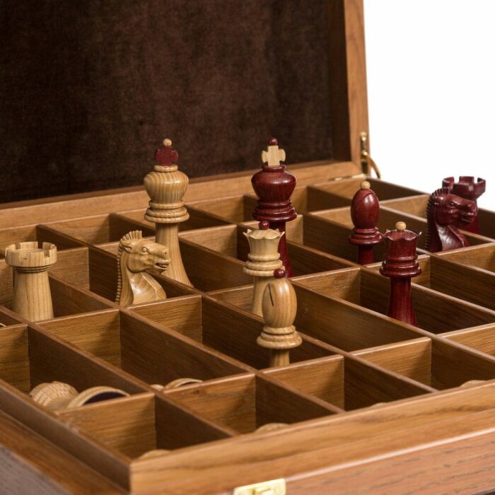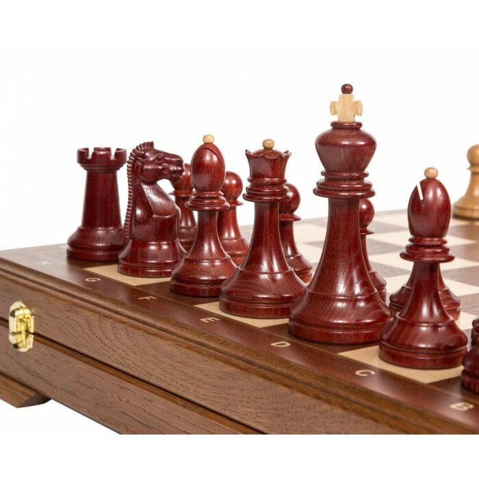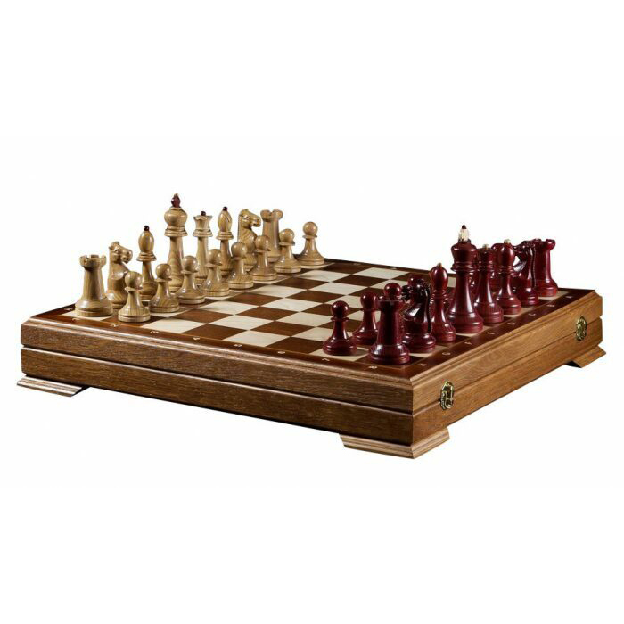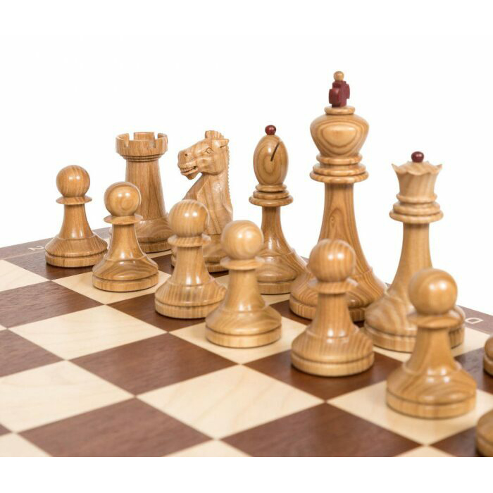 Материалы:фигуры светлые – ясень, матовый лак; фигуры темные - ясень тонированный, матовый лак; все с утяжелением, основания подклеены замшем; шахматное поле - шелковисто-матовый лак; клетка светлая – клен; клетка темная - сапеле; корпус - массив ясень тонировка; крышка открывается и удерживается в вертикальном положении петлями с ограничителем, внутри ячейки для каждой фигурки, ножки доски подклеены замшем.
