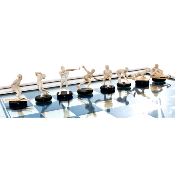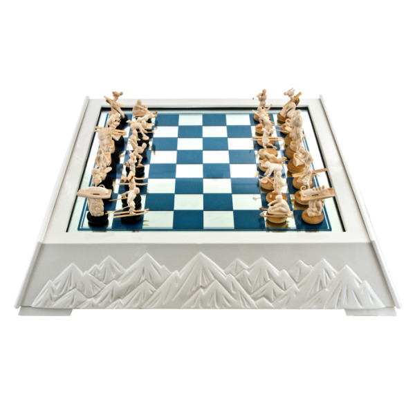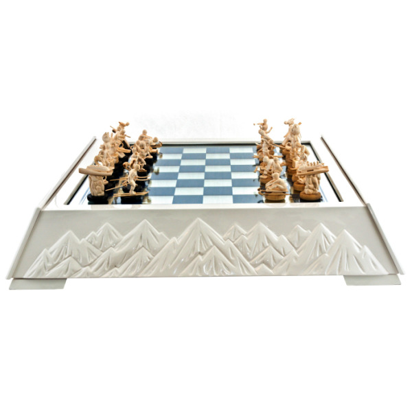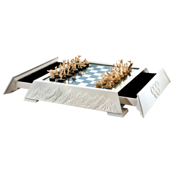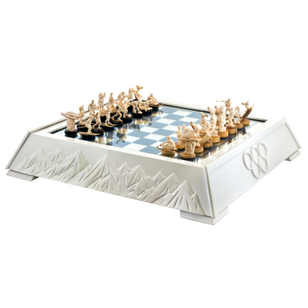 Доска, выполненная из сахарного клёна, обрамлена белыми пиками гор, словно вершинами Кавказа, которые стояли свидетелями грандиозных событий Олимпиады. Это не просто шахматный комплект, это — застывшая метафора величия спорта и идеалов, ради которых люди стремятся к новым высотам.