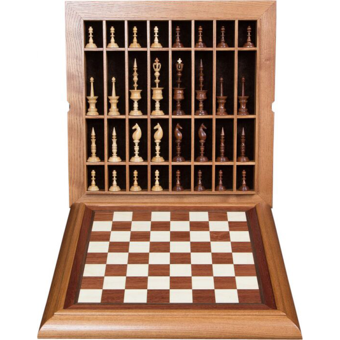 Материалы:фигуры светлые - клен, матовый лак; фигуры темные - красное дерево, матовый лак; все с утяжелением, основания подклеены замшей. Шахматное поле - матовый лак; клетка светлая - клен; клетка темная - красное дерево; корпус - массив ясень тонировка.