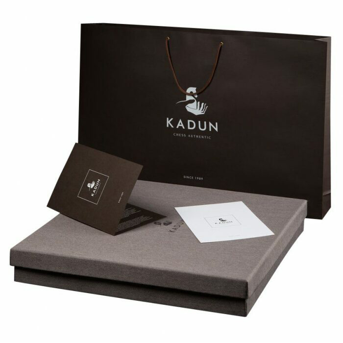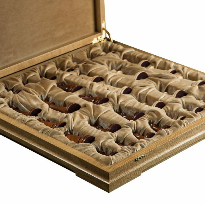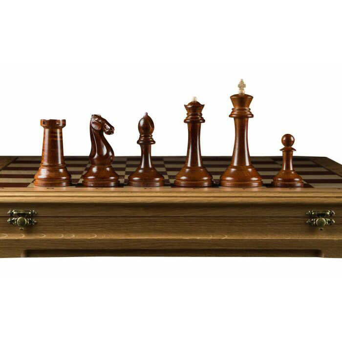 Материалы:фигуры светлые – клен, матовый лак; фигуры темные - клен тонированный, матовый лак; все с утяжелением, основания подклеены замшем; шахматное поле - шелковисто-матовый лак; клетка светлая – клен; клетка темная - красное дерево; корпус - массив полевого дуба; крышка открывается и удерживается в вертикальном положении петлями с ограничителем, внутри мягкий ложемент из бархата, ячейки для каждой фигурки, ножки доски подклеены замшем.