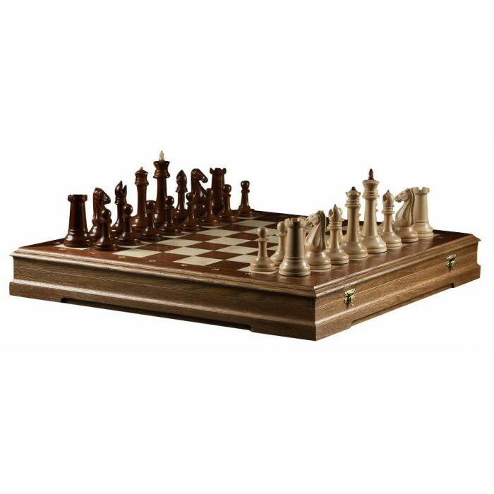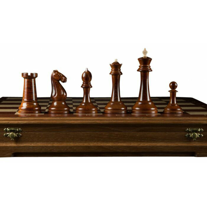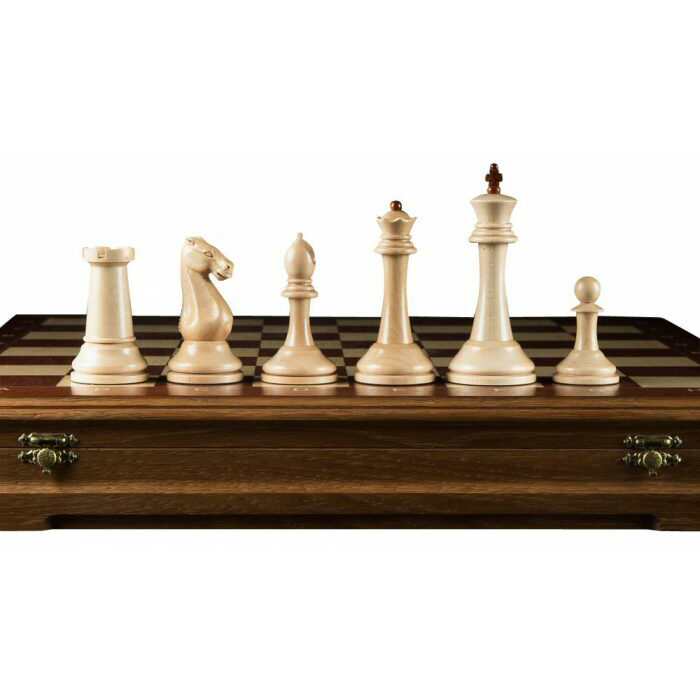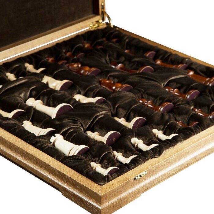Материалы:фигуры светлые – клен, матовый лак; фигуры темные - клен тонированный, матовый лак, все с утяжелением, основания подклеены замшем; шахматное поле - шелковисто-матовый лак; клетка светлая – клен; клетка темная - красное дерево; корпус - массив полевого дуба; крышка открывается и удерживается в вертикальном положении петлями с ограничителем, внутри мягкий ложемент из бархата, ячейки для каждой фигурки, ножки доски подклеены замшем.