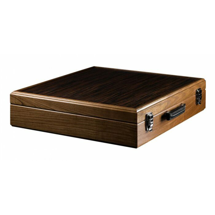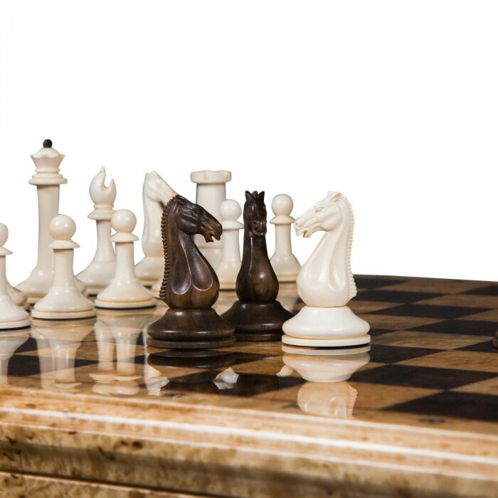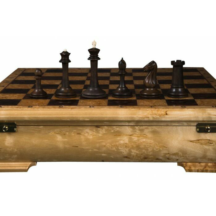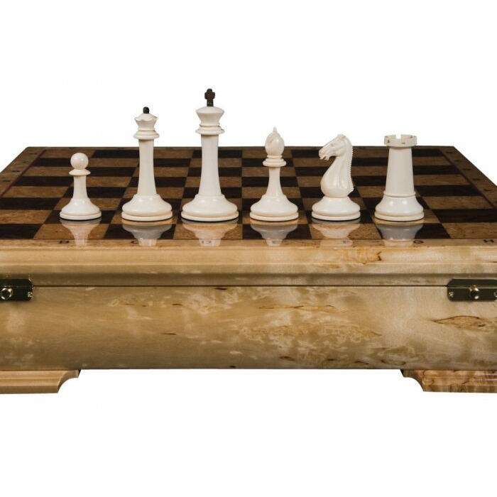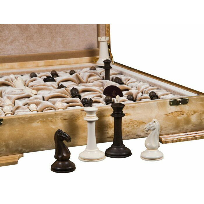 Материалы: фигуры светлые — бивень мамонта (mammoth tusk); фигуры темные — макассар, с утяжелением, основания подклеены замшей; шахматное поле — рояльный лак (полиэфир); клетка светлая — карельская береза; клетка темная — корень ореха; буквы — клен птичий глаз; корпус — массив карельской березы; мягкий глубокий ложемент из бархата с ячейками для каждой фигуры, крышка открывается и удерживается в вертикальном положении петлями с ограничителем, ножки подклеены замшей.
