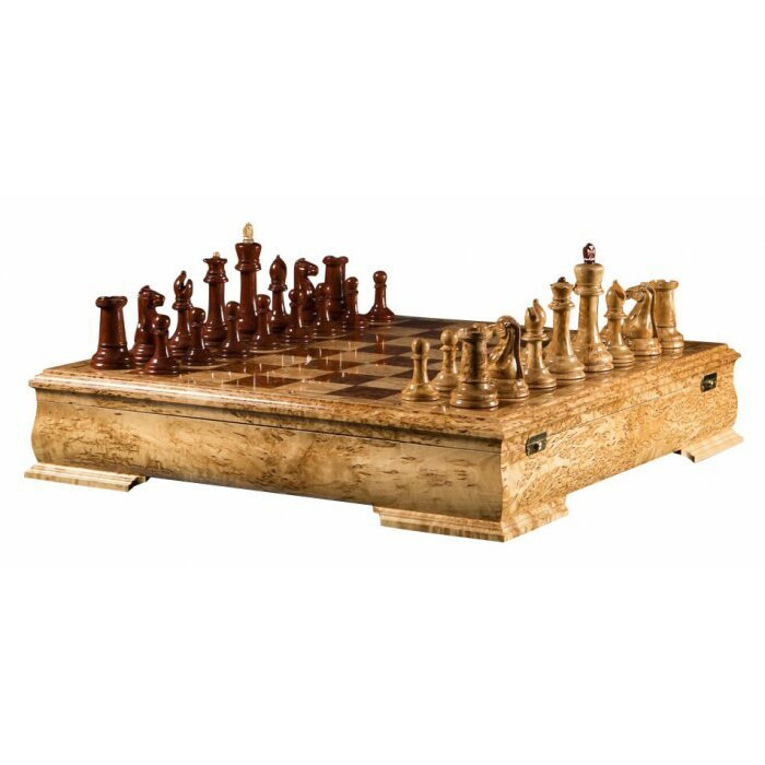 Шахматы "Стаунтон Люкс" — изысканный атрибут досуга для тех, кто ценит сложные формы, благородные материалы и интеллектуальное превосходство. Выполненный вручную ларец из карельской берёзы и бубинги отличается мощной геометрией, подчёркнутой натуральной текстурой древесины и глянцем профессиональной полировки. Утяжелённые фигуры с классическим силуэтом "Стаунтон" гармонируют с глубоким рисунком доски, создавая ощущение внутренней силы и спокойной уверенности в себе.