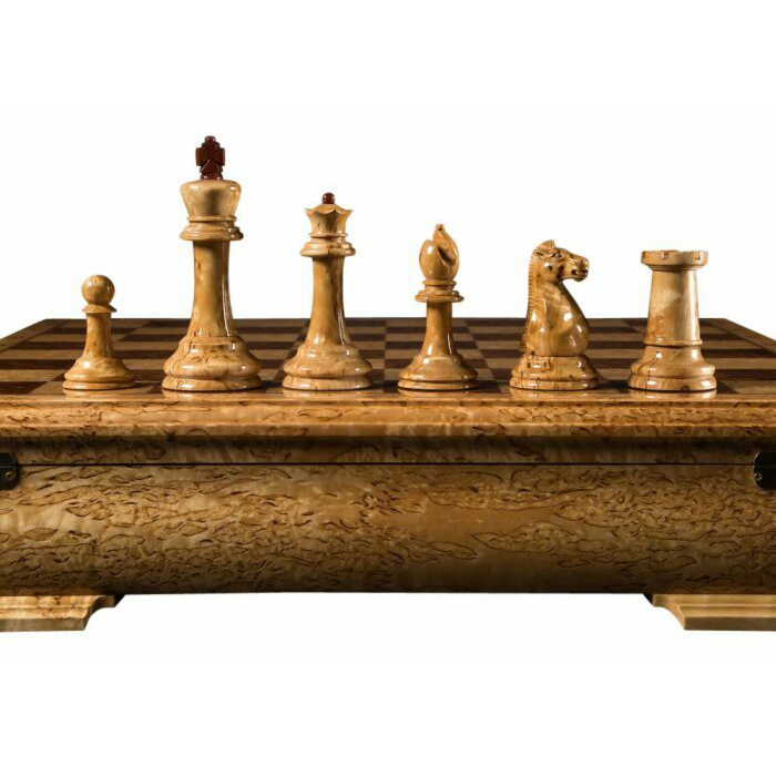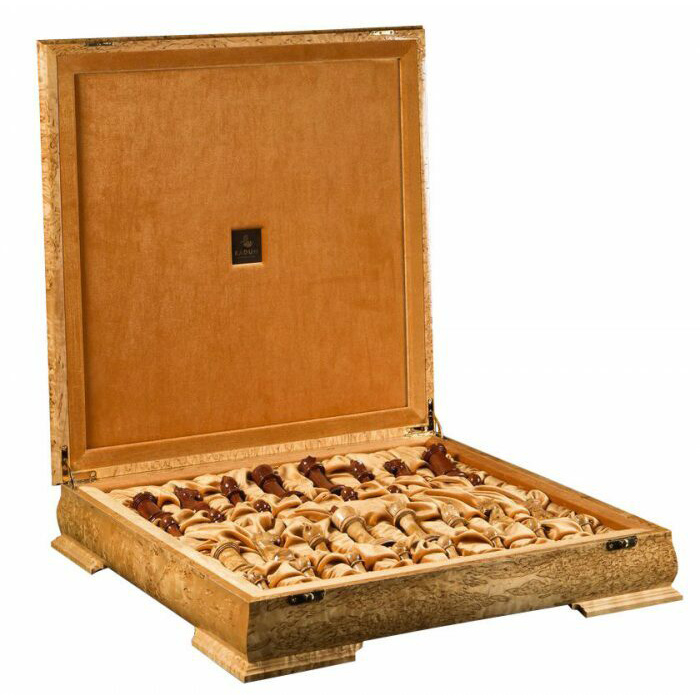 Игра оформлена в лучших традициях столярного и токарного мастерства. Бубинга придаёт композиции насыщенность и тепло, карельская берёза вносит акценты светом и мраморной графикой волокон. Каждая фигура выточена вручную, отполирована и сбалансирована — даже король и ферзь ощущаются в ладони как весомые символы власти. Шкатулка снабжена надежной фурнитурой и отделениями, обитая мягким материалом для бережного хранения.