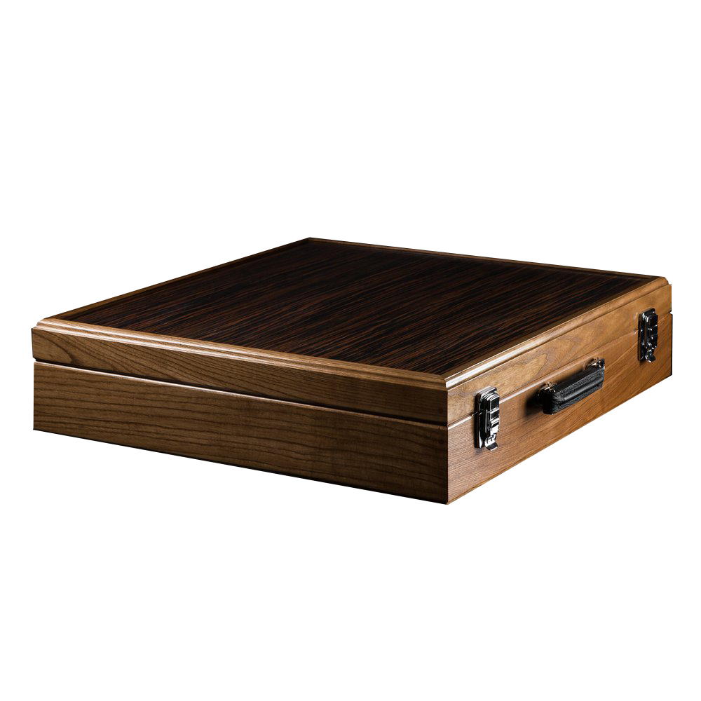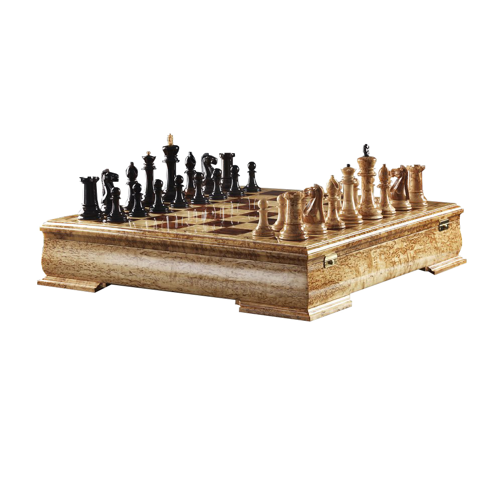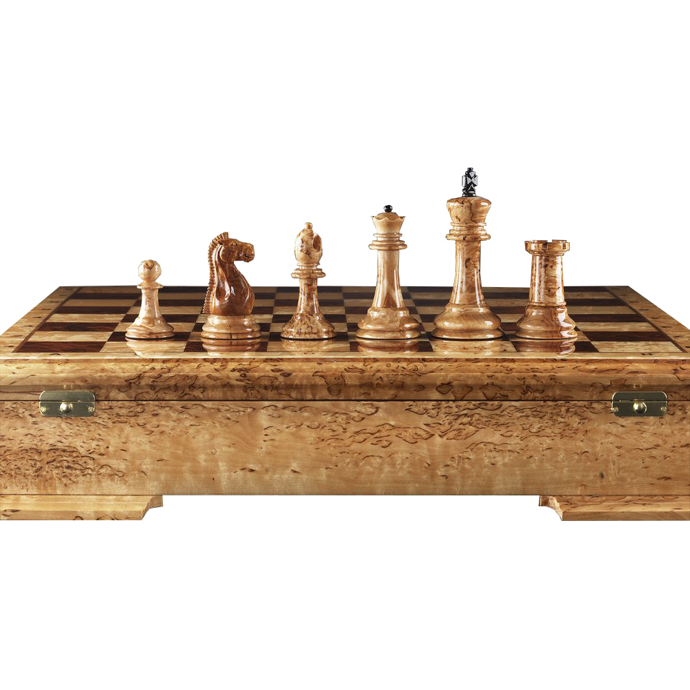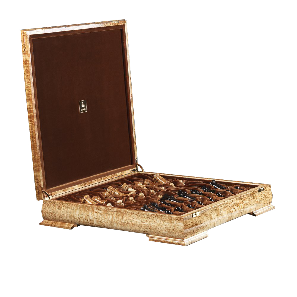 Шахматы Staunton Luxe, созданные из макассарского дерева и карельской берёзы, представляют собой слияние безупречного вкуса и природной красоты в самом изысканном её выражении. Драгоценный ларец — словно артефакт из частной коллекции знатока, влюблённого в совершенство форм и материалов. Основание изготовлено из редкой карельской берёзы с её характерной живой текстурой, напоминающей мраморную крошку, тогда как шахматное поле инкрустировано шпоном макассара, создающим графичную и глубокую игру света на глянцевой поверхности. Закрывающийся на латунные замки кейс с внешней стороны отделан тёмным деревом, вносящим строгую контрастность в общую композицию.