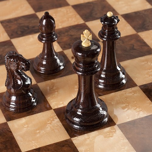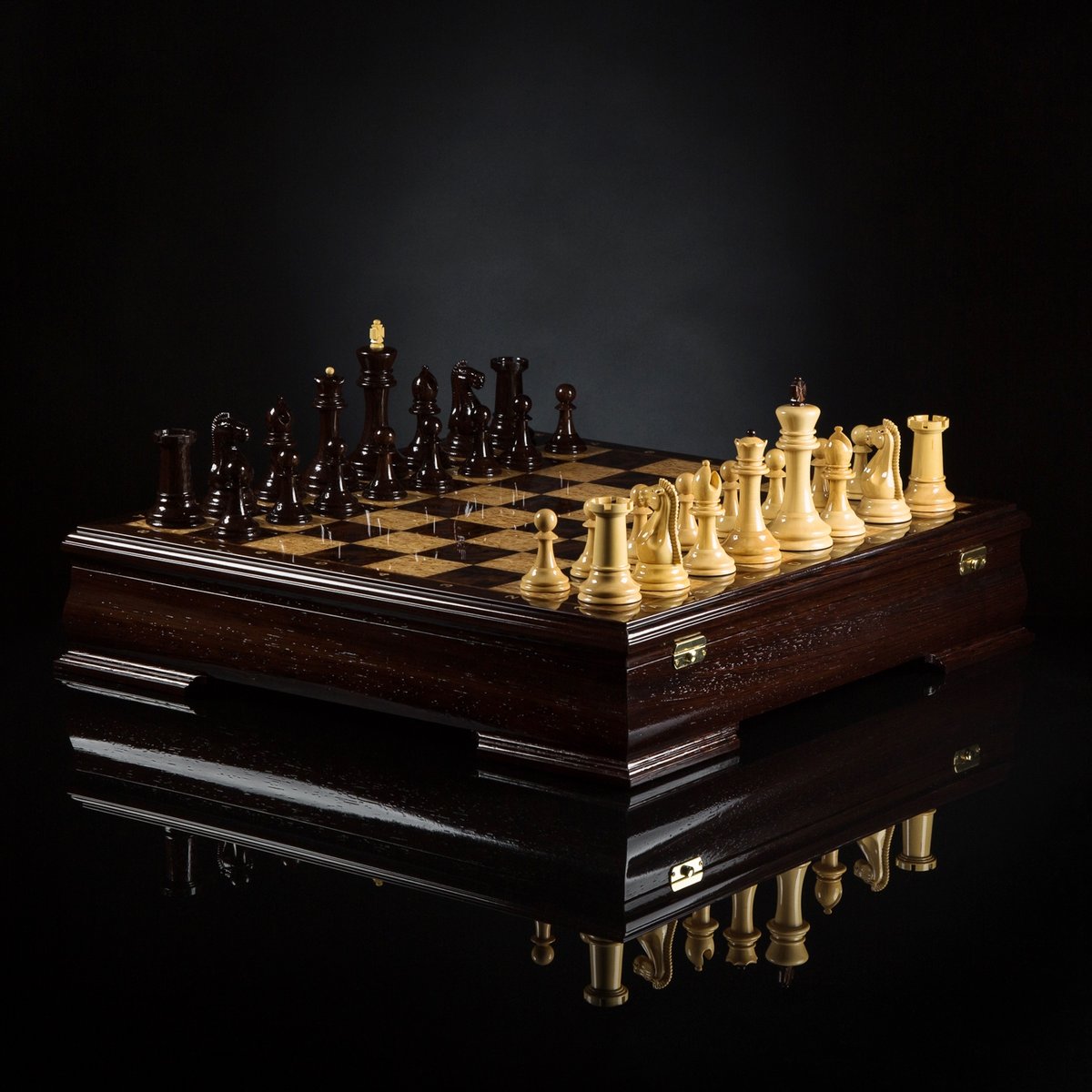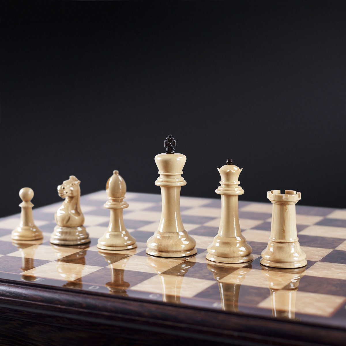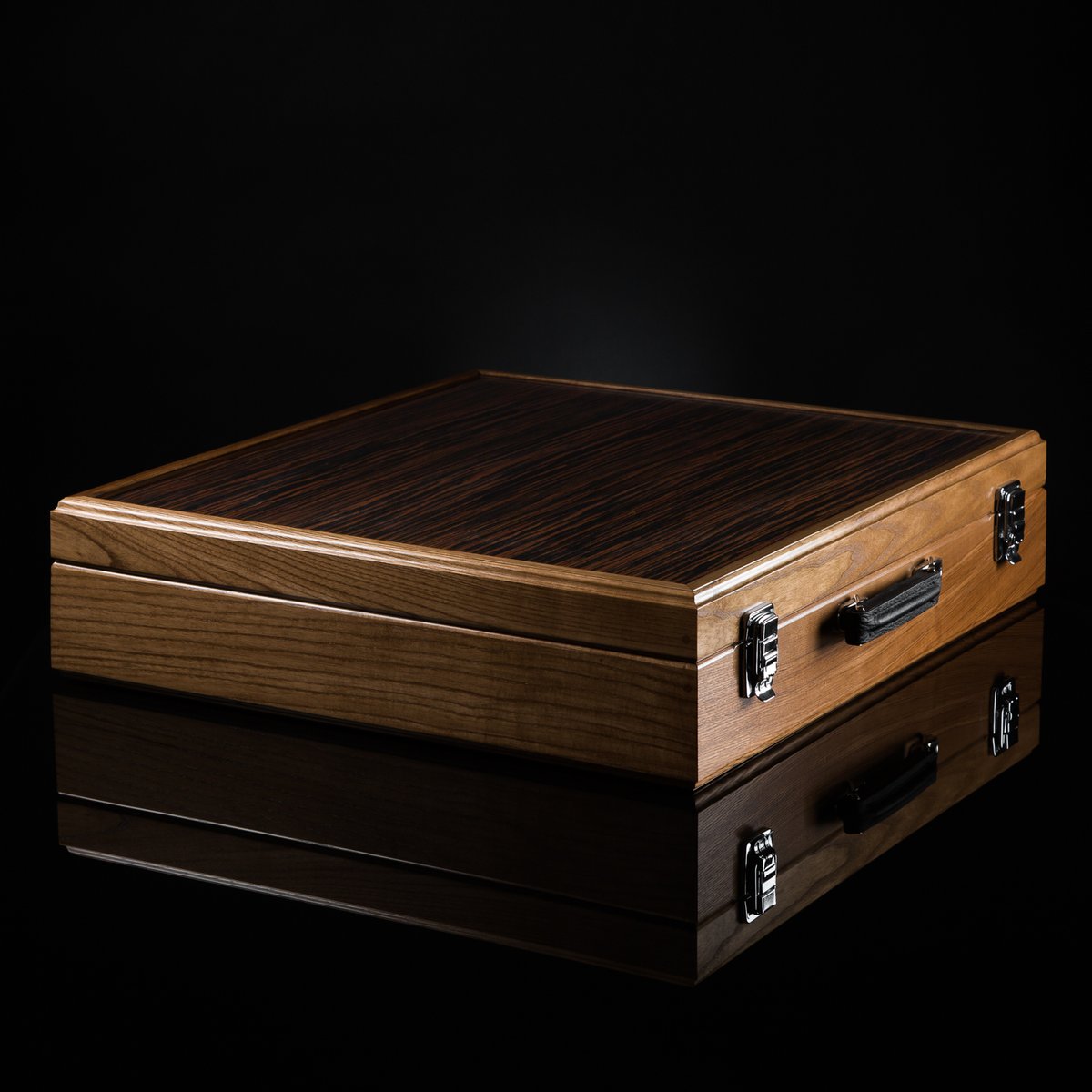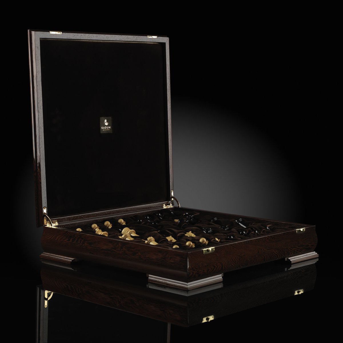 Поле, инкрустированное шпоном капа и березового сувеля, завораживает природным рисунком, в котором будто застыли клубящиеся туманы времени. Его переливчатая текстура играет в свете, отражаясь в многослойной полировке как в чернильной глади озера. Внутри — ложементы, обтянутые черным велюром: каждая фигура размещается в отдельной ячейке, подобно артефактам в личной коллекции. Упакован комплект в деревянный кейс с отделкой зебрано, украшенный металлическими замками и кожаной ручкой — предмет, достойный путешествия на борту частного самолёта.