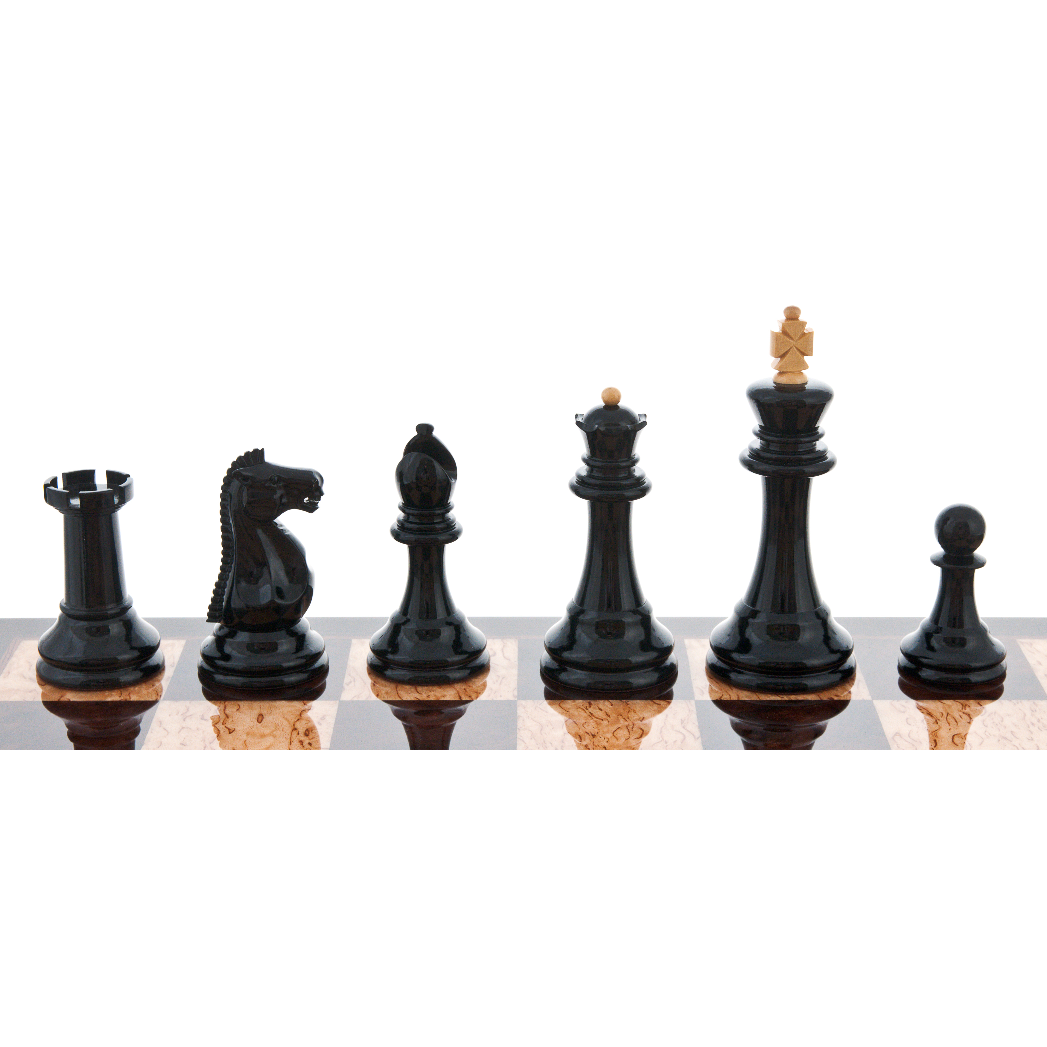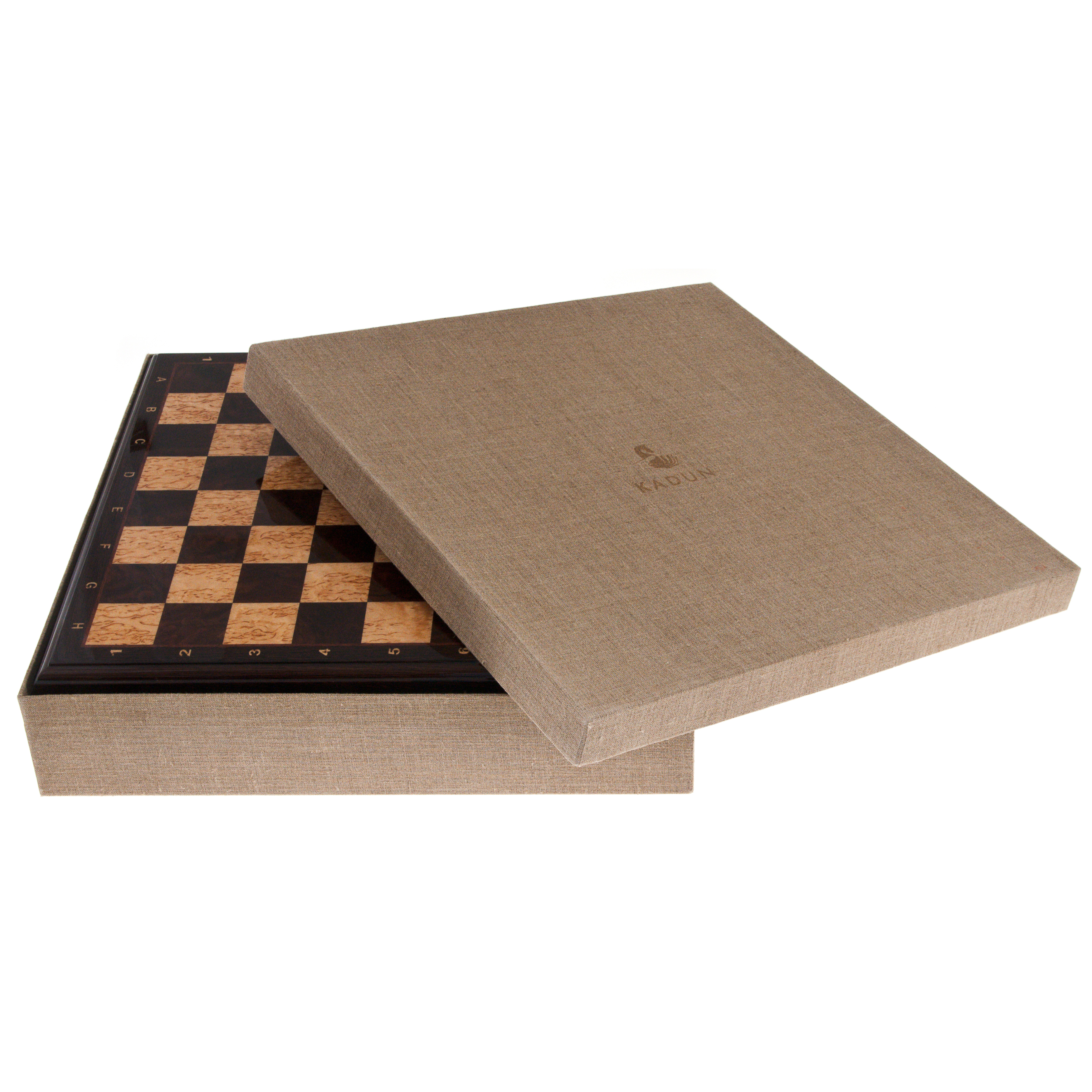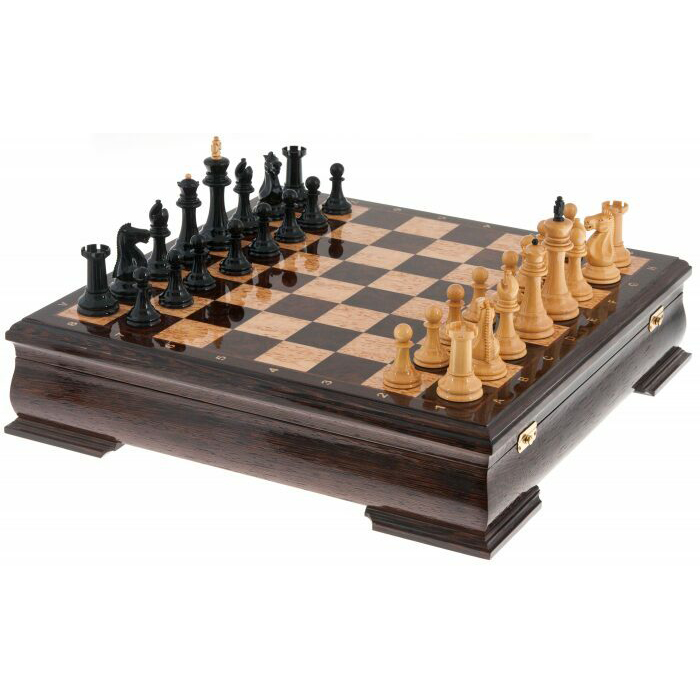 Материалы:фигуры с утяжелением, светлые – колхидский самшит; темные - колхидский самшит с тонированием; корпус - венге, рояльный лак, инкрустация клен и птичий глаз; клетки - карельская береза (светлая), корень ореха (темная); внутренний ложемент под раздвигающимся на две части полем.