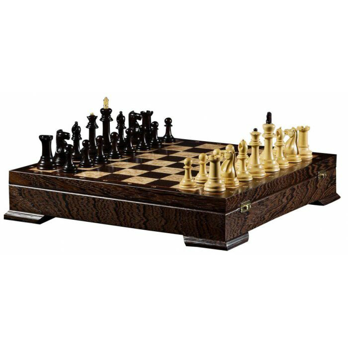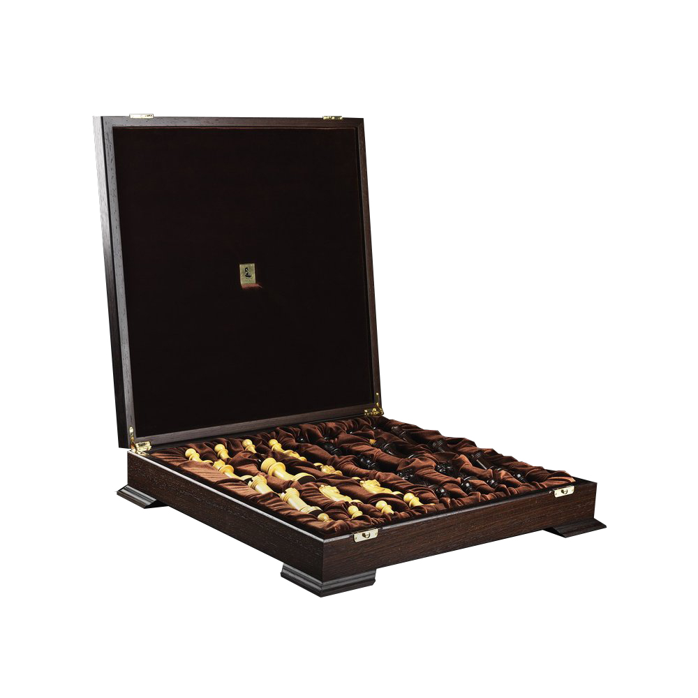 Материалы:фигуры с утяжелением, светлые – колхидский самшит; темные - африканский венге; корпус - массив африканского дерева венге, инкрустация кленом; клетки - клен птичий глаз (светлая), венге (темная); внутренний ложемент под раздвигающимся на две части полем.