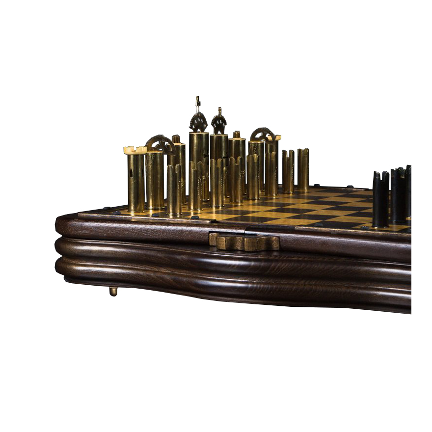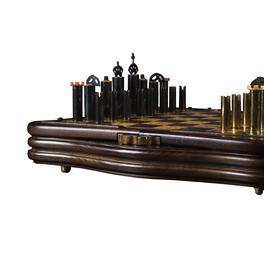 Основание шахматной доски выполнено из тёмного массива с мягко изогнутыми гранями, подчеркивающими органичную пластику конструкции. Внутри — индивидуальные ниши под каждую фигуру, вырезанные в плотной вкладке с контрастной обивкой. Поверхность игрового поля — идеальный геометрический контрапункт к вычурным силуэтам фигур: ясень и венге чередуются в чётком ритме, на котором разворачивается дуэль умов. Механизм открытия доски выполнен в виде металлических шестерёнок — не просто декоративный жест, а отсылка к эстетике викторианского авангарда, где форма всегда служит функции, а функция — вдохновению.