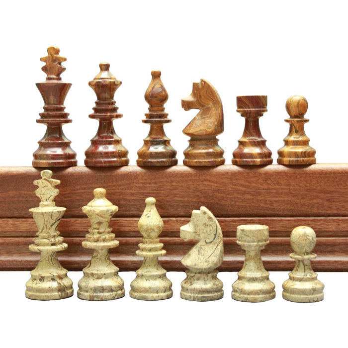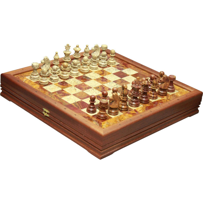 Шахматы из красного дерева "Американские" фигуры из красного оникса и мрамора бутичина