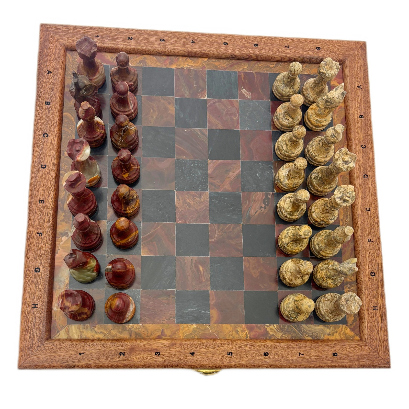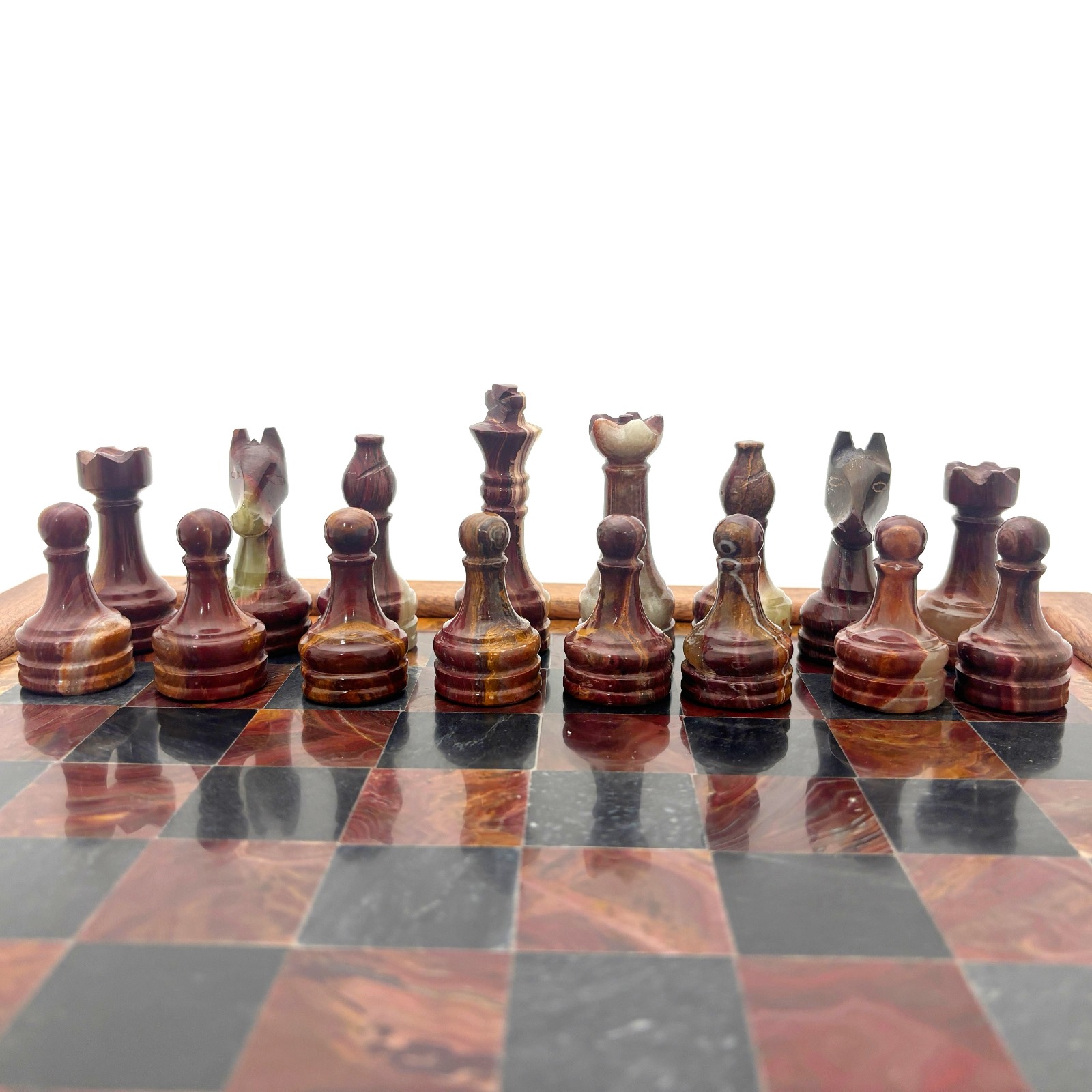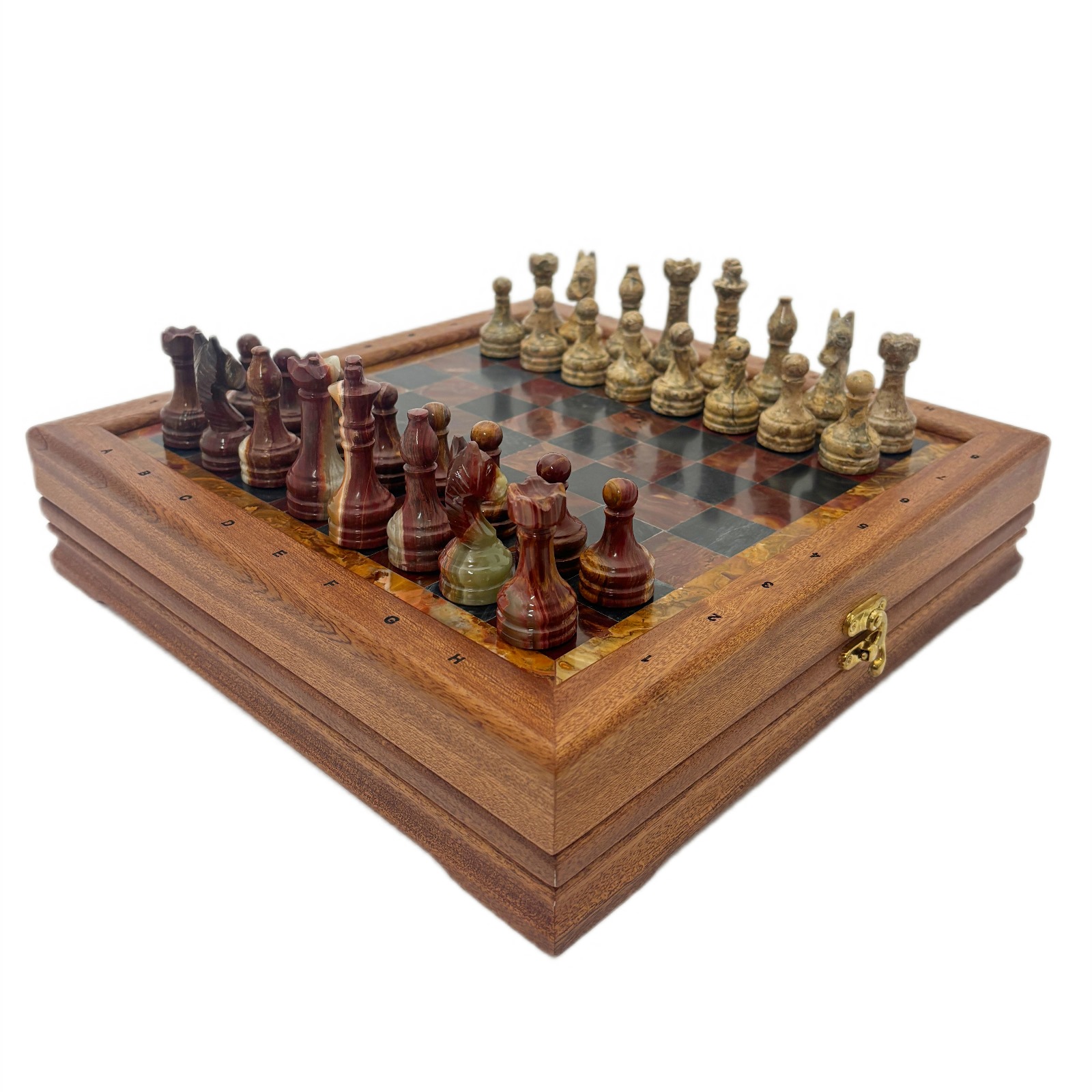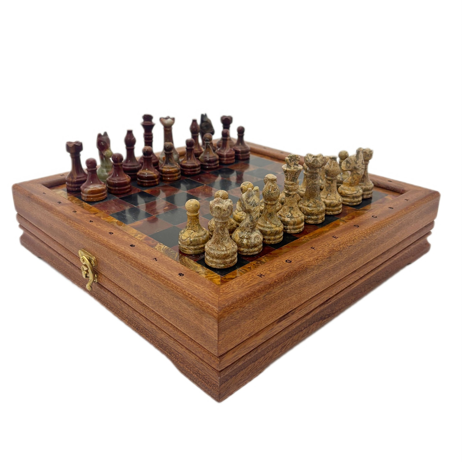 Шахматы из красного дерева "Европейские" малые, фигуры из красного оникса и ракушечника
