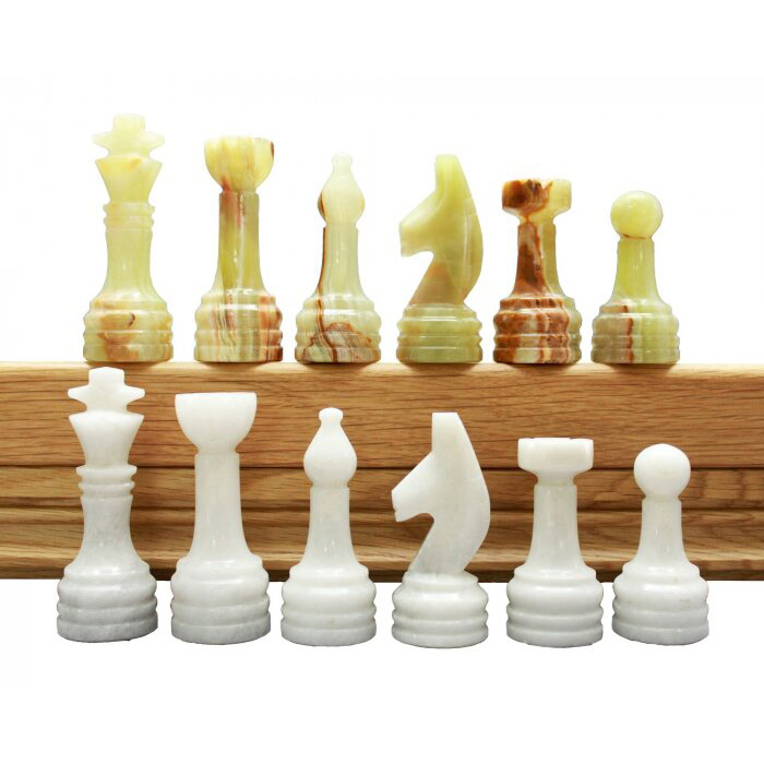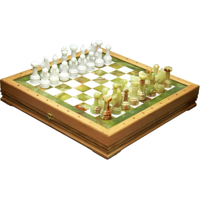 Шахматы из массива дуба, фигуры из белого мрамора и зеленого оникса