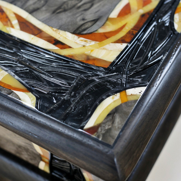 Каждая грань этого произведения искусства говорит о безукоризненном мастерстве. Янтарные инкрустации, вплетенные в структуру древесины, словно оживают на свету, создавая игру оттенков, передающих энергию и силу древнего материала. Текстура карельской березы, известная своей неповторимой красотой и уникальными узорами, придает столу непередаваемую глубину и характер, который ощущается в каждом прикосновении.