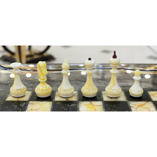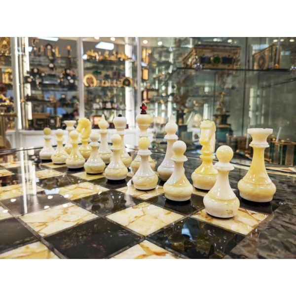 Изюминкой шахматного стола являются фигуры, которые выглядят как настоящие произведения искусства. Их золотое и серебряное покрытие дополняют малахитовые основания, что делает каждую партию игрой не только умов, но и эстетического наслаждения. Фигуры словно оживают на доске, превращая каждое движение в часть грандиозного плана.