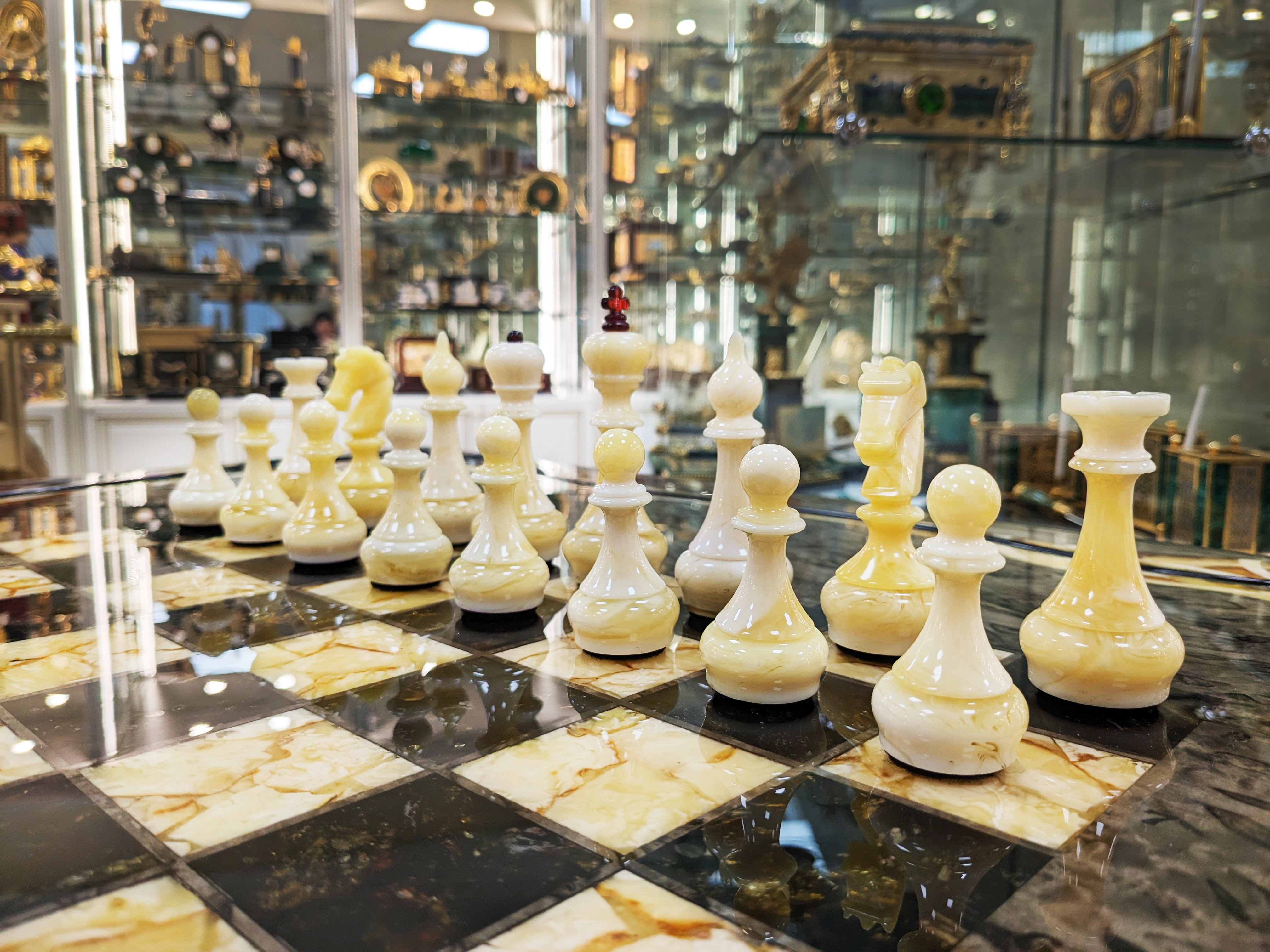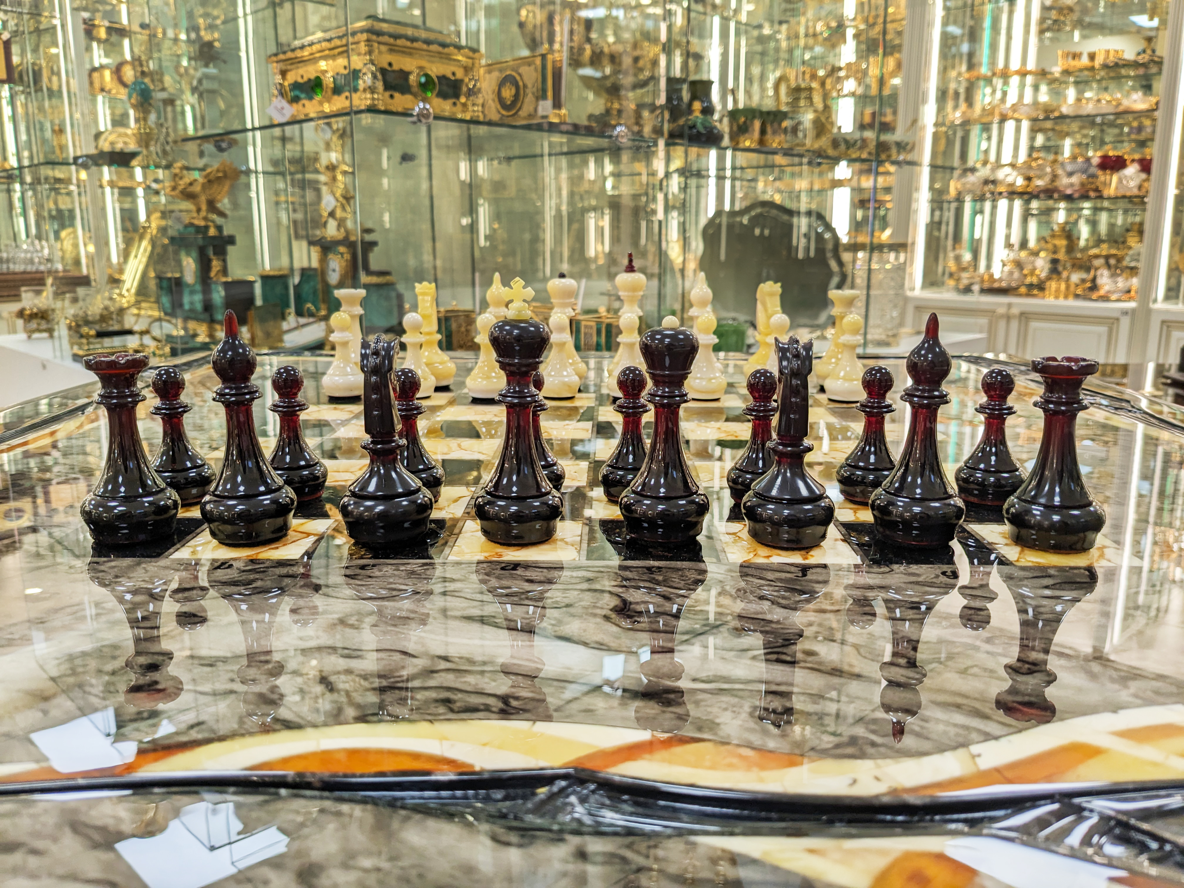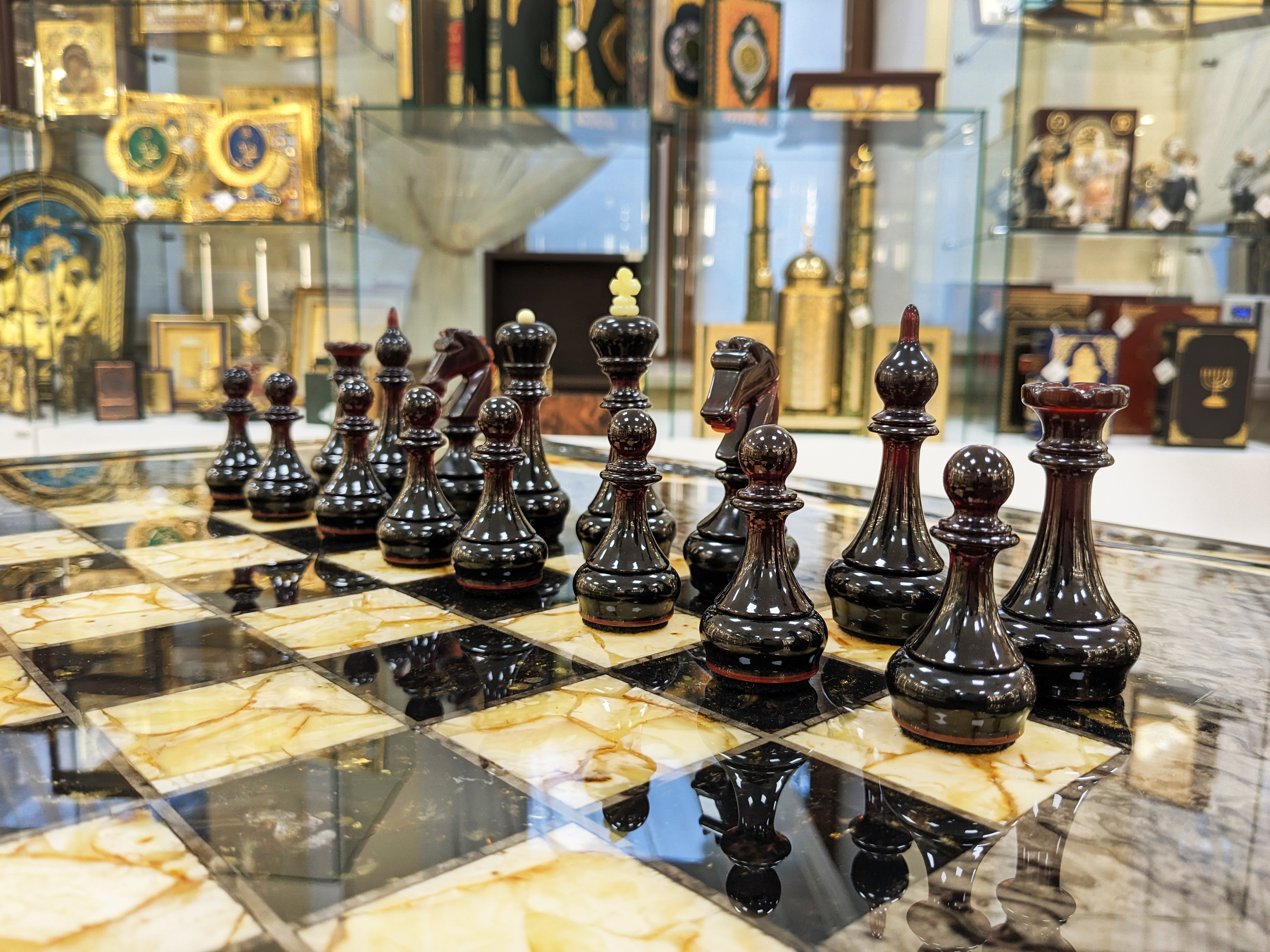 Шахматный стол из карельской березы и янтаря "Инфинити"