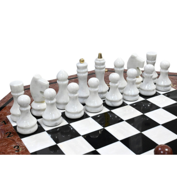 Шахматное поле, набранное из шпона ореха и сахарного клёна, словно приглашает к игре, где каждый ход становится частью стратегической дуэли, в которой победа достигается не только силой, но и умом. Темные и светлые квадраты шахматной доски, как символы вечной борьбы света и тьмы, указывают на безмолвную войну, разворачивающуюся на поле. Здесь шахматы становятся метафорой битвы, в которой честь и достоинство определяют судьбы королей.