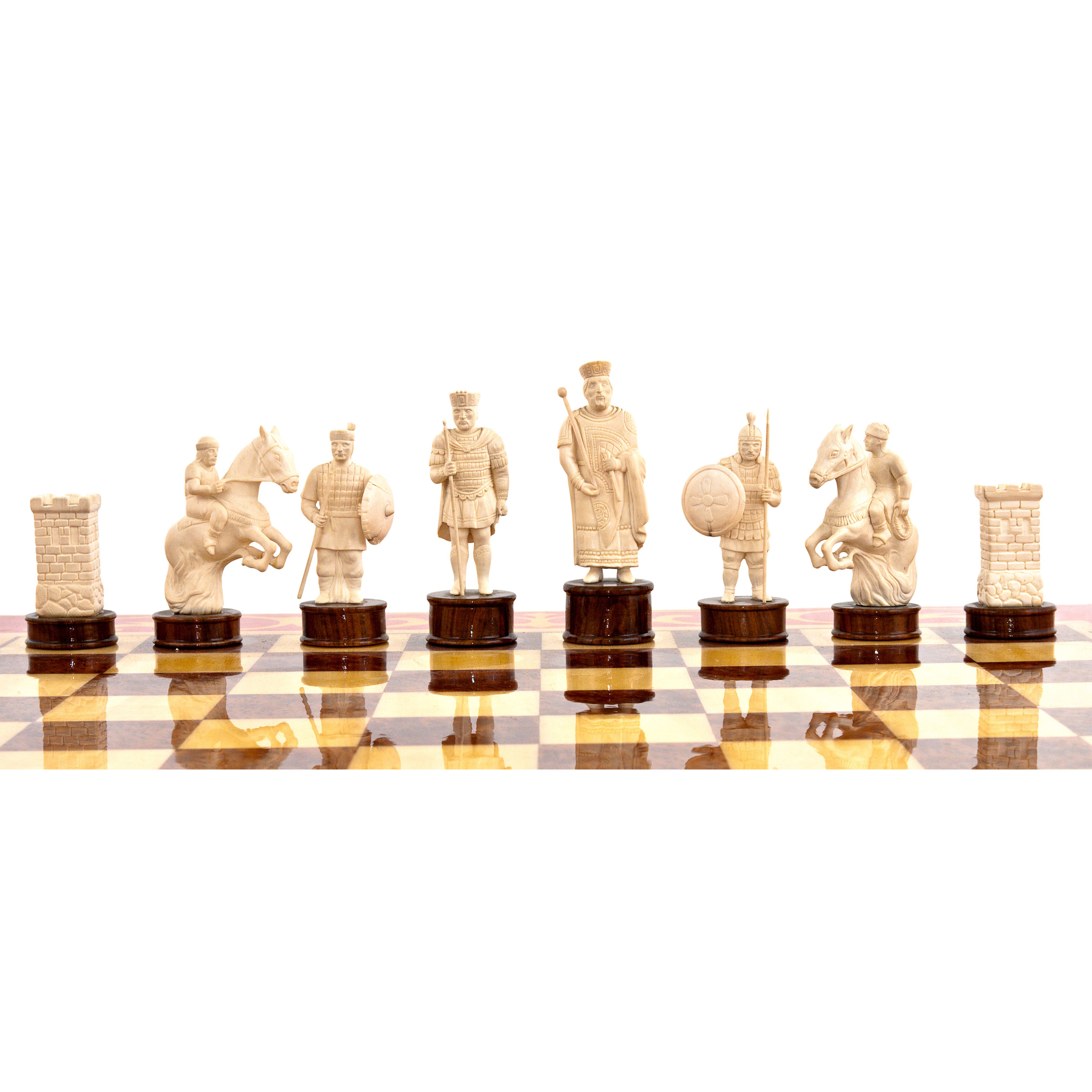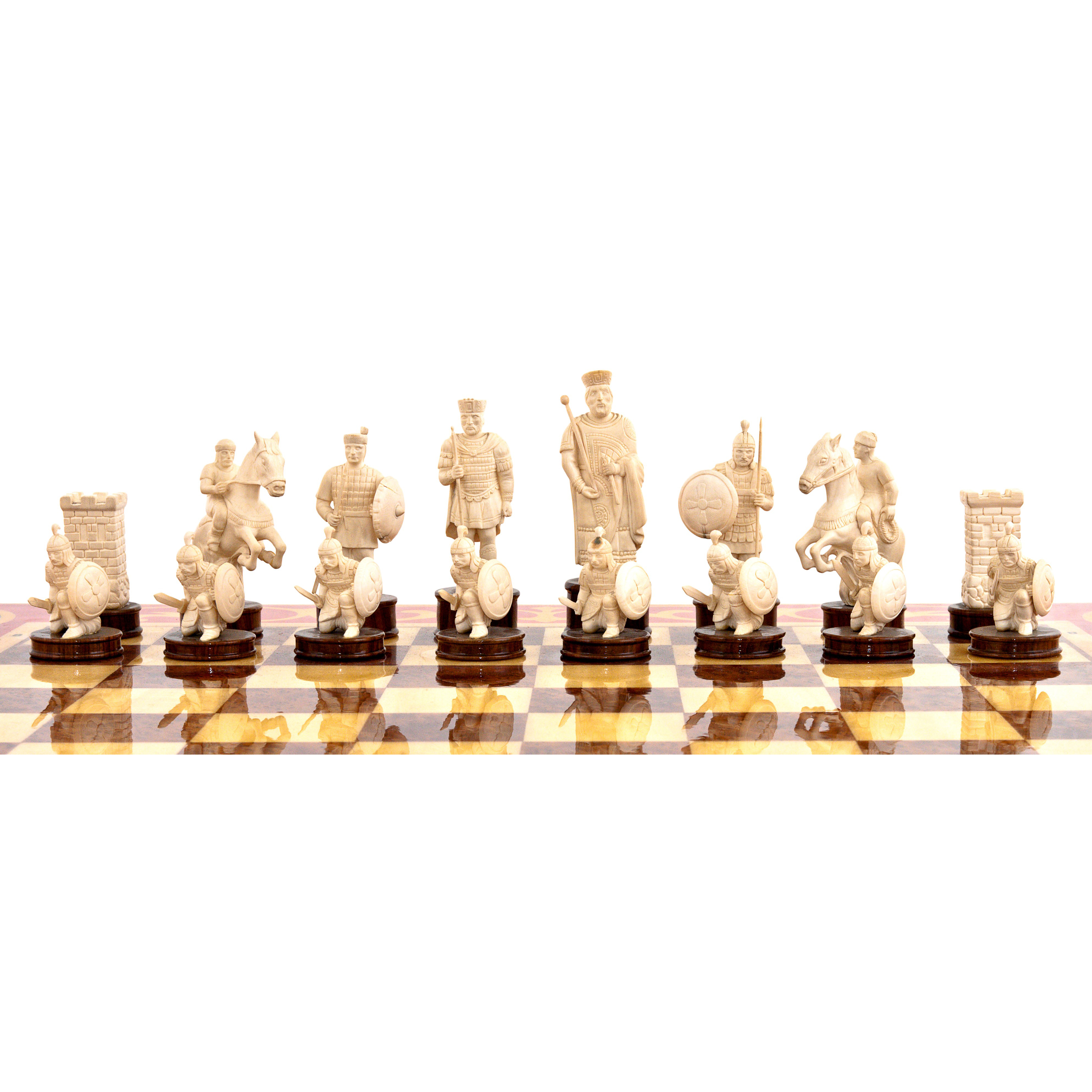 Шахматное поле набрано из шпона клёна и корня вавоны, что создаёт уникальный контраст светлых и тёмных оттенков, придавая поверхности текстуру и глубину. Каждый ход на такой доске становится не просто игрой, а настоящим стратегическим сражением, где древние князья и воины сражаются за трон в интеллектуальной дуэли.