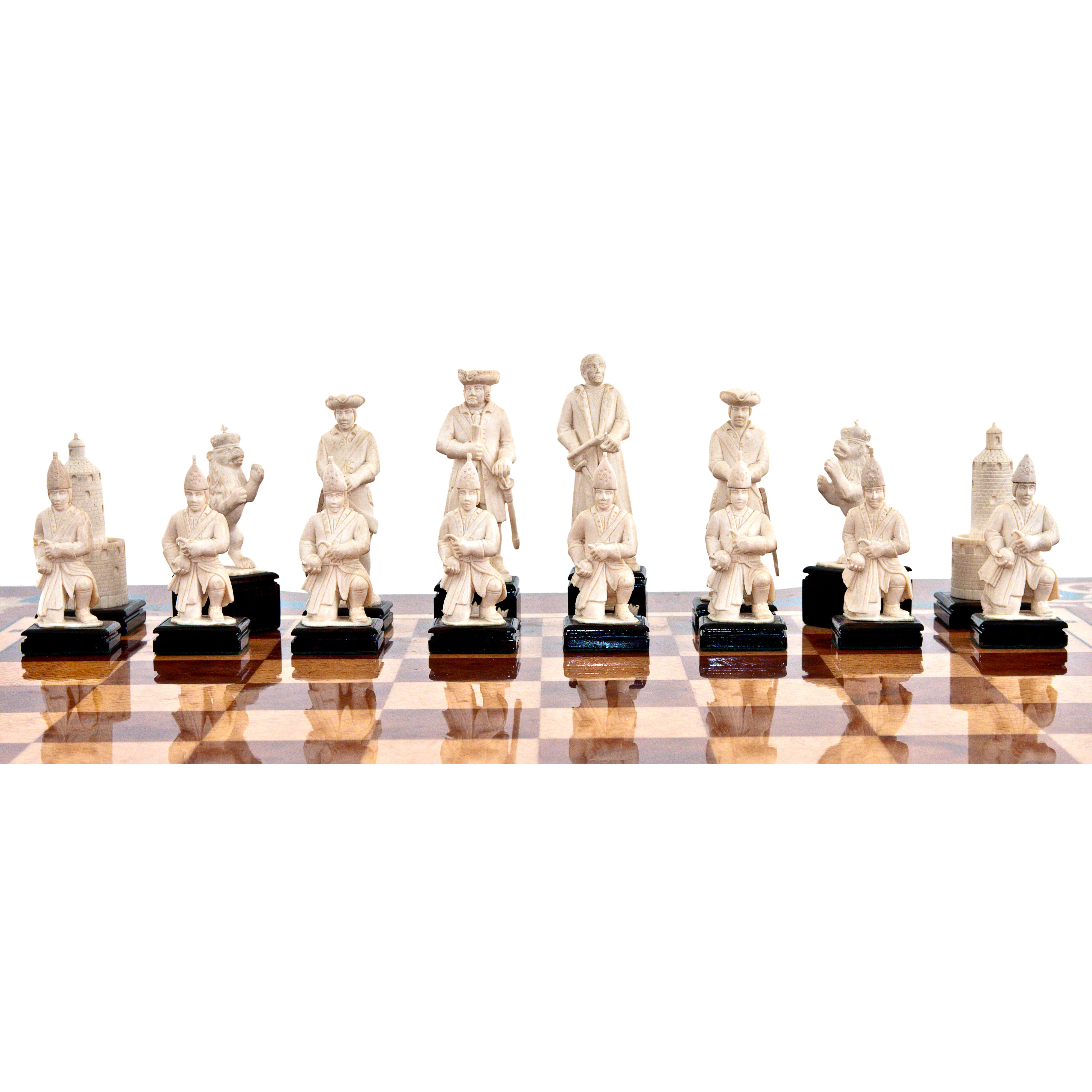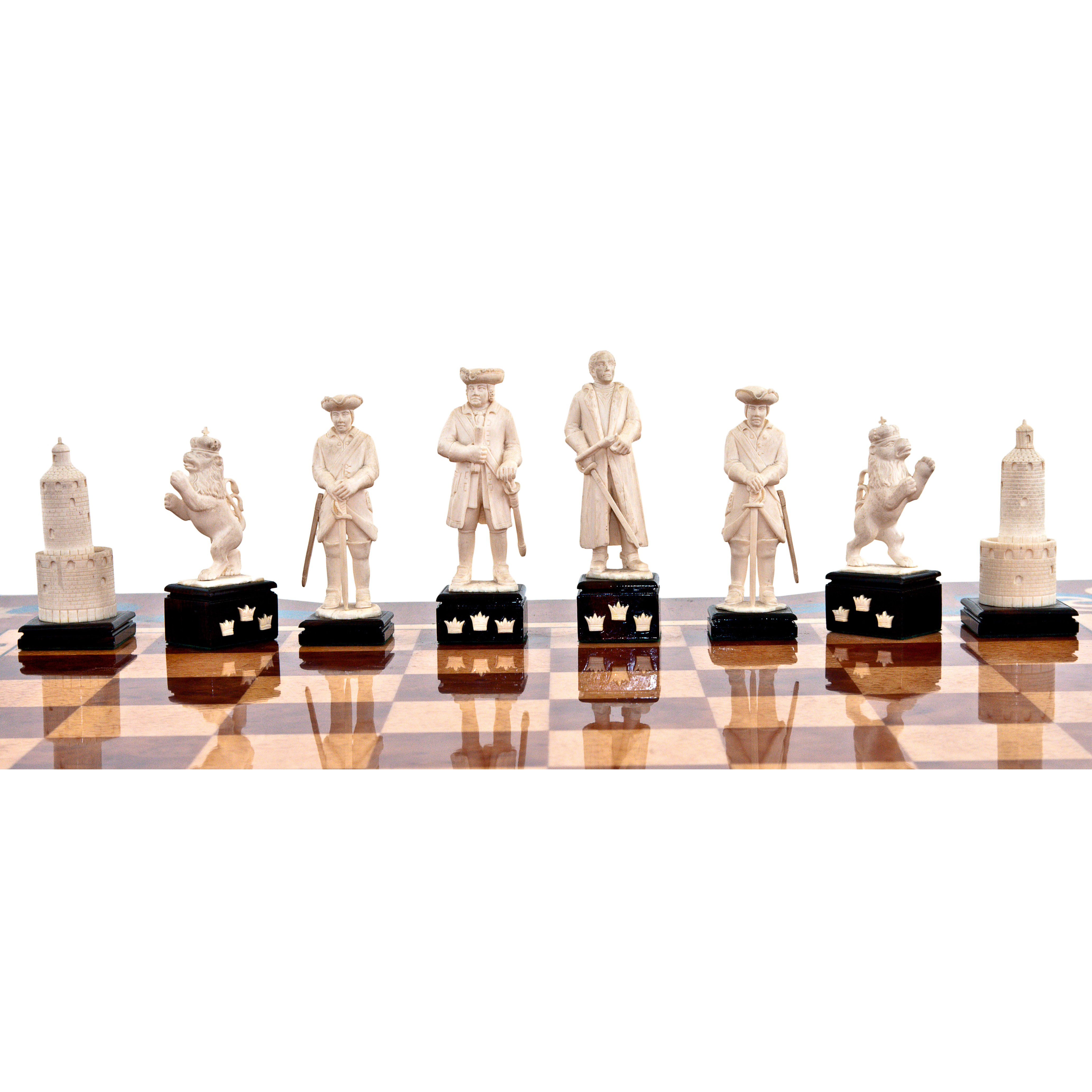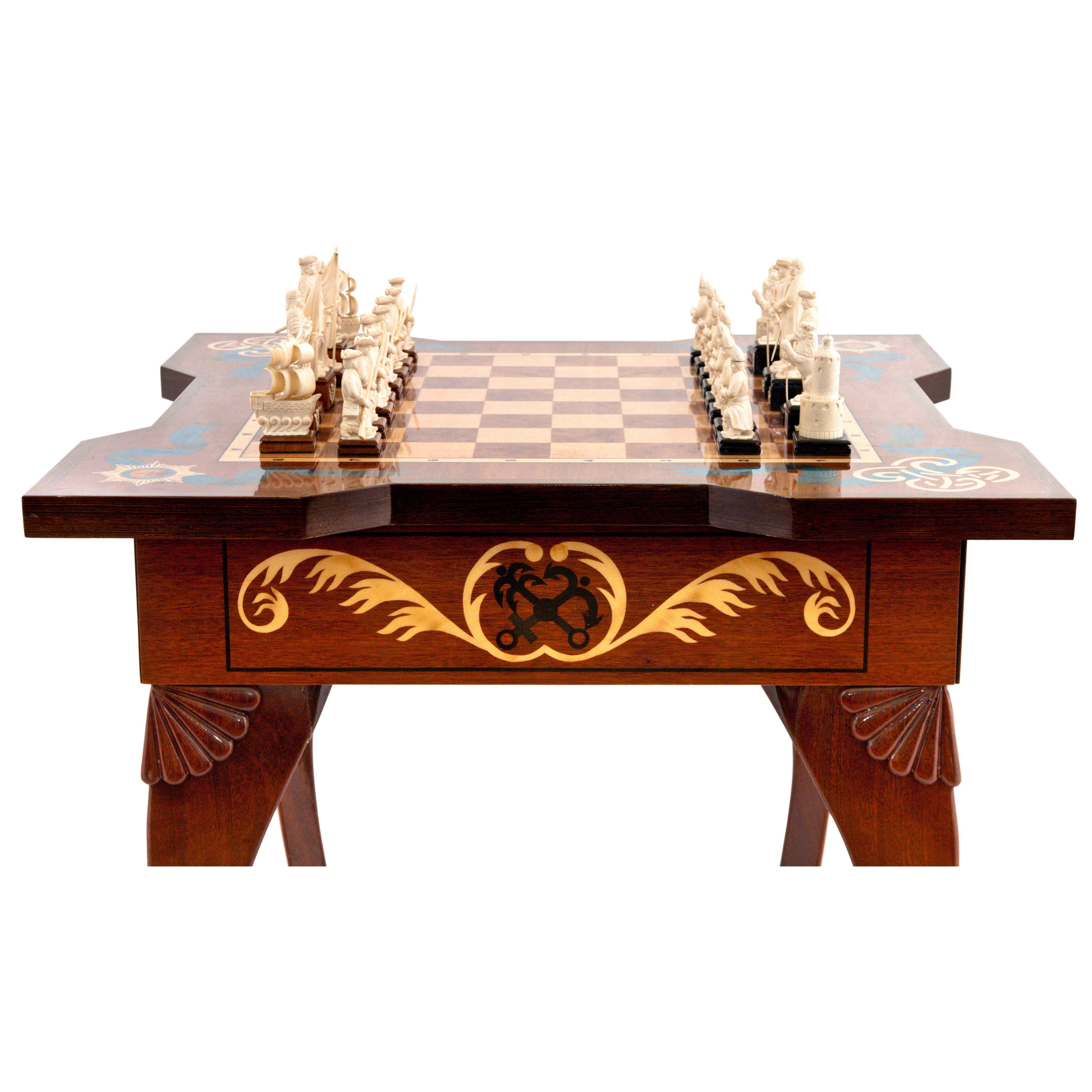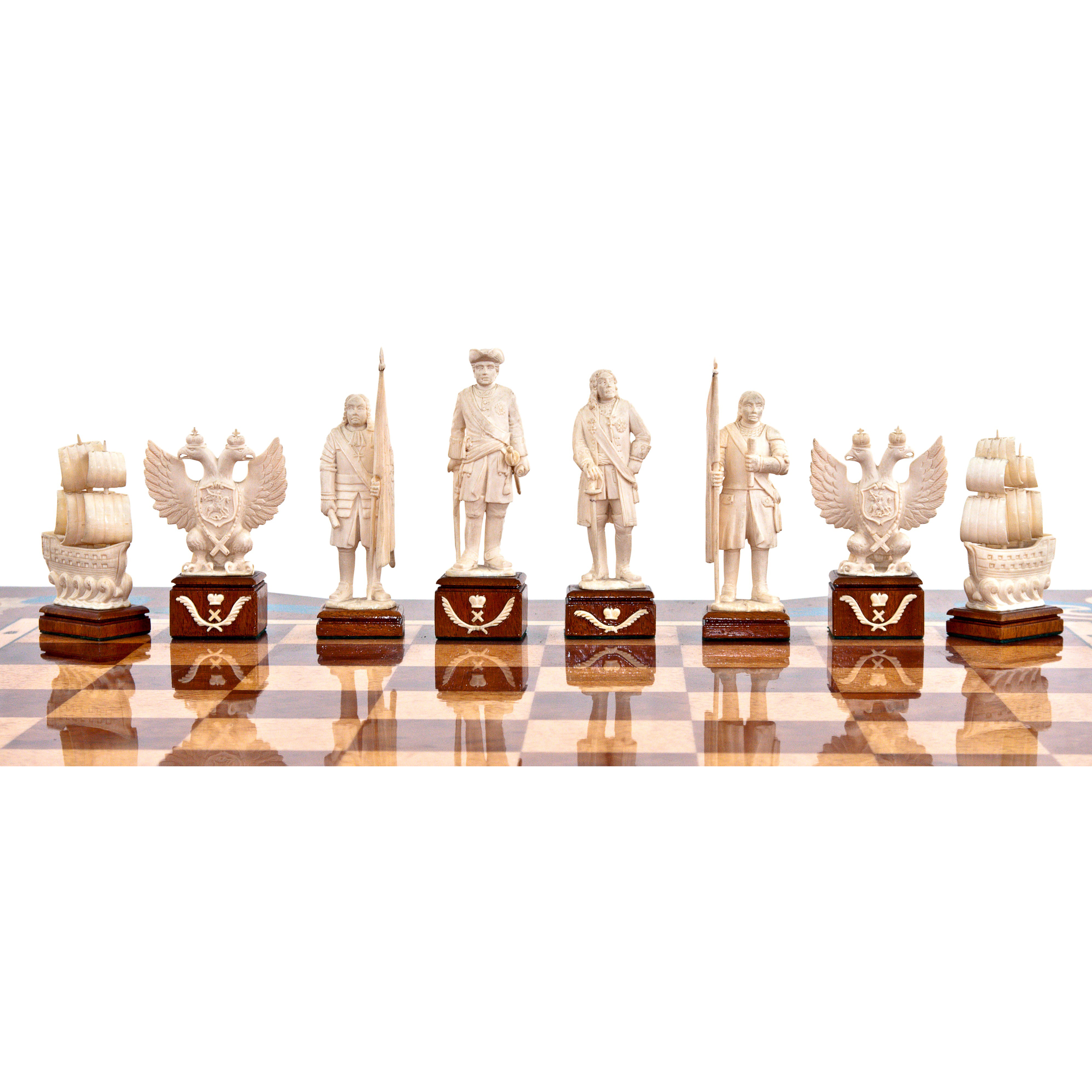 Само поле, сложенное из шпона карельской берёзы и махагона, напоминает о царских лесах и имперских владениях, которые разрастались под чутким руководством Петра. Здесь каждая фигура, как солдат его армии, готова покорить новые рубежи, а сам шахматный стол превращается в арену исторических сражений, где каждое движение — это шаг к триумфу, к созданию великой державы.