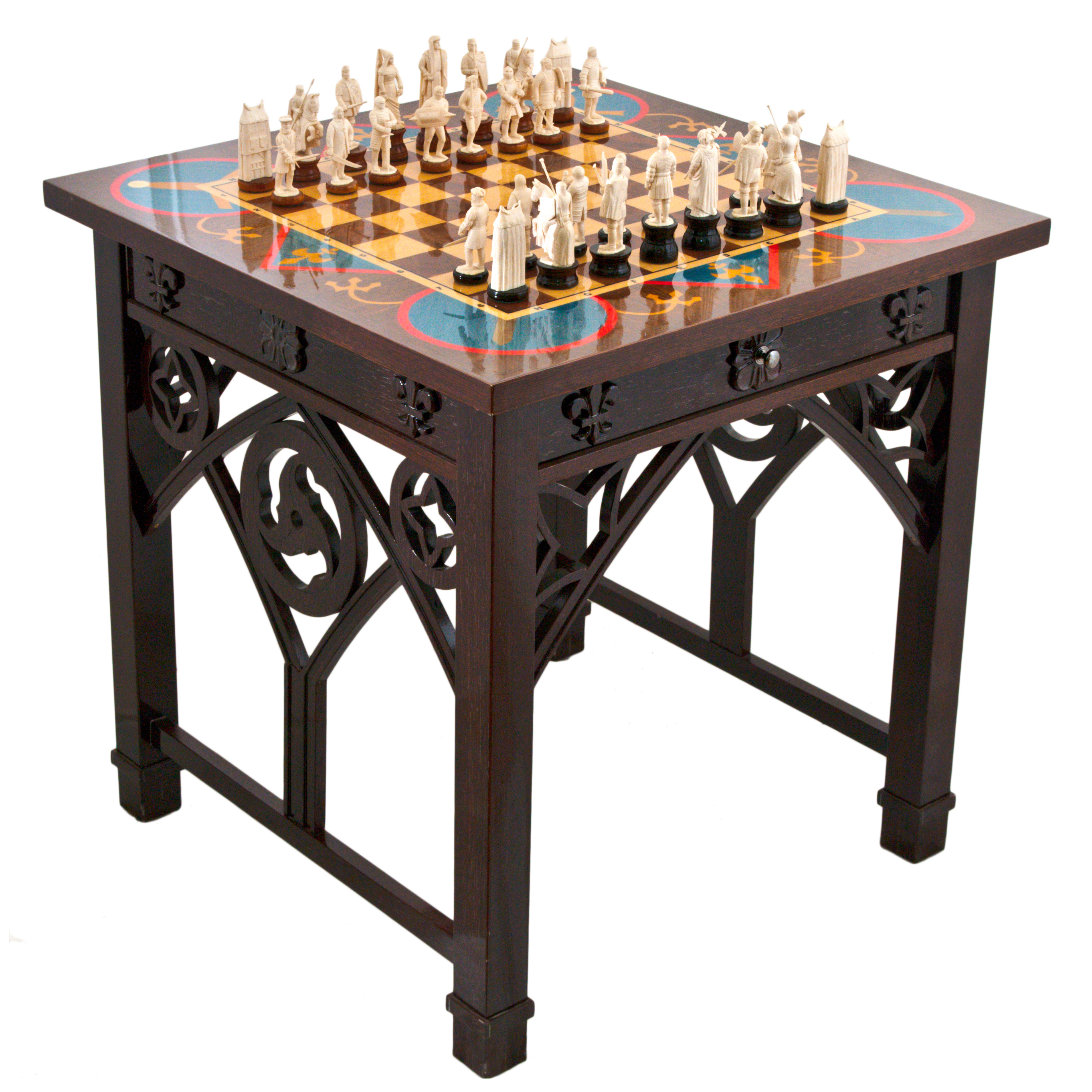 Дизайн этого шахматного стола, выполненного из роскошного и редкого дерева венге, создаёт впечатление готического шедевра, прямиком перенесённого из средневековой Европы. Архитектурные стрельчатые арки, украшающие основание, отсылают к величественным соборам и замкам, где рыцари, жившие по законам чести, защищали своё имя и своё королевство. Розетки в форме "рыбьих пузырей", триада которых образует изящный орнамент, напоминают о тайне и утончённой красоте эпохи, когда эстетика архитектуры и искусства достигала небывалых высот.
