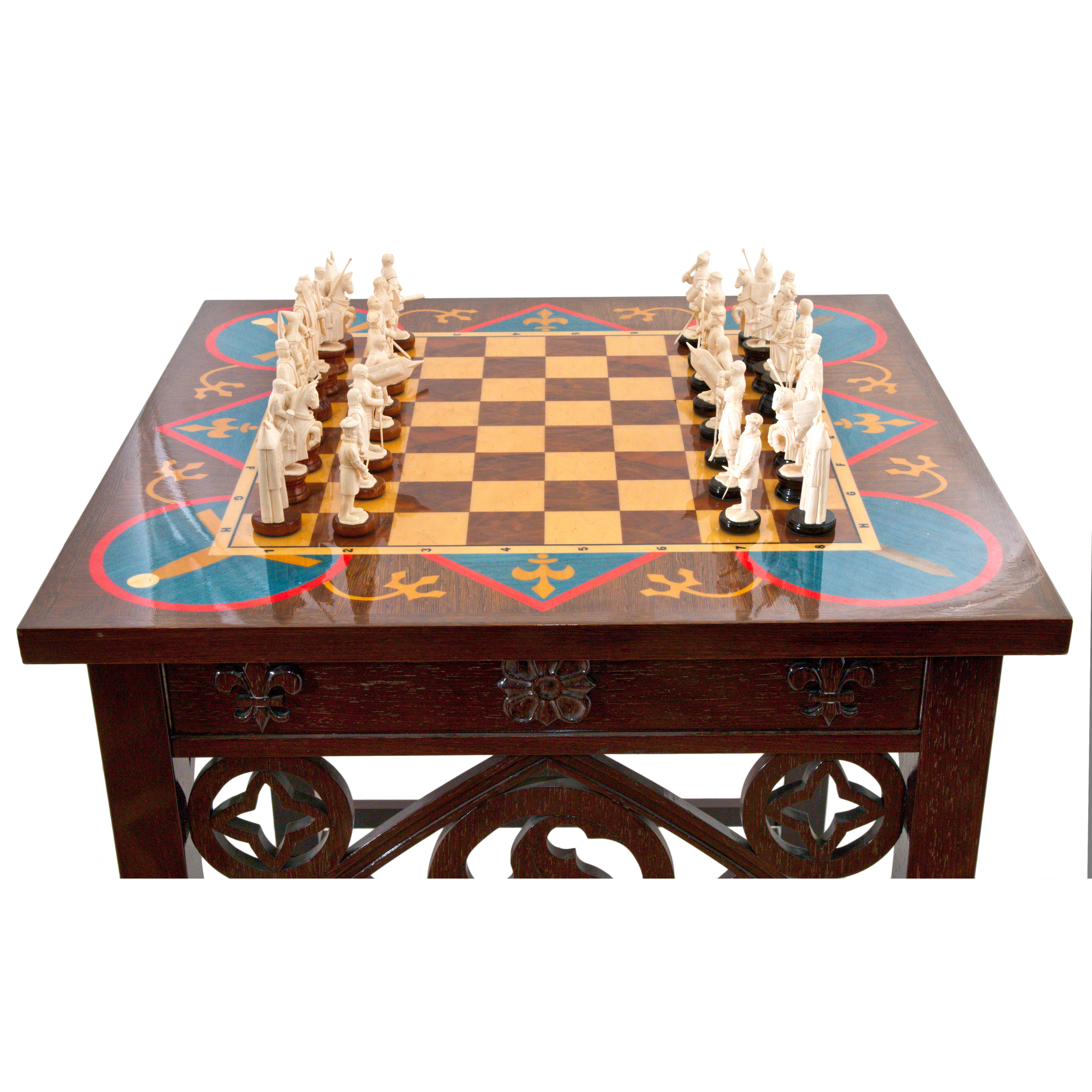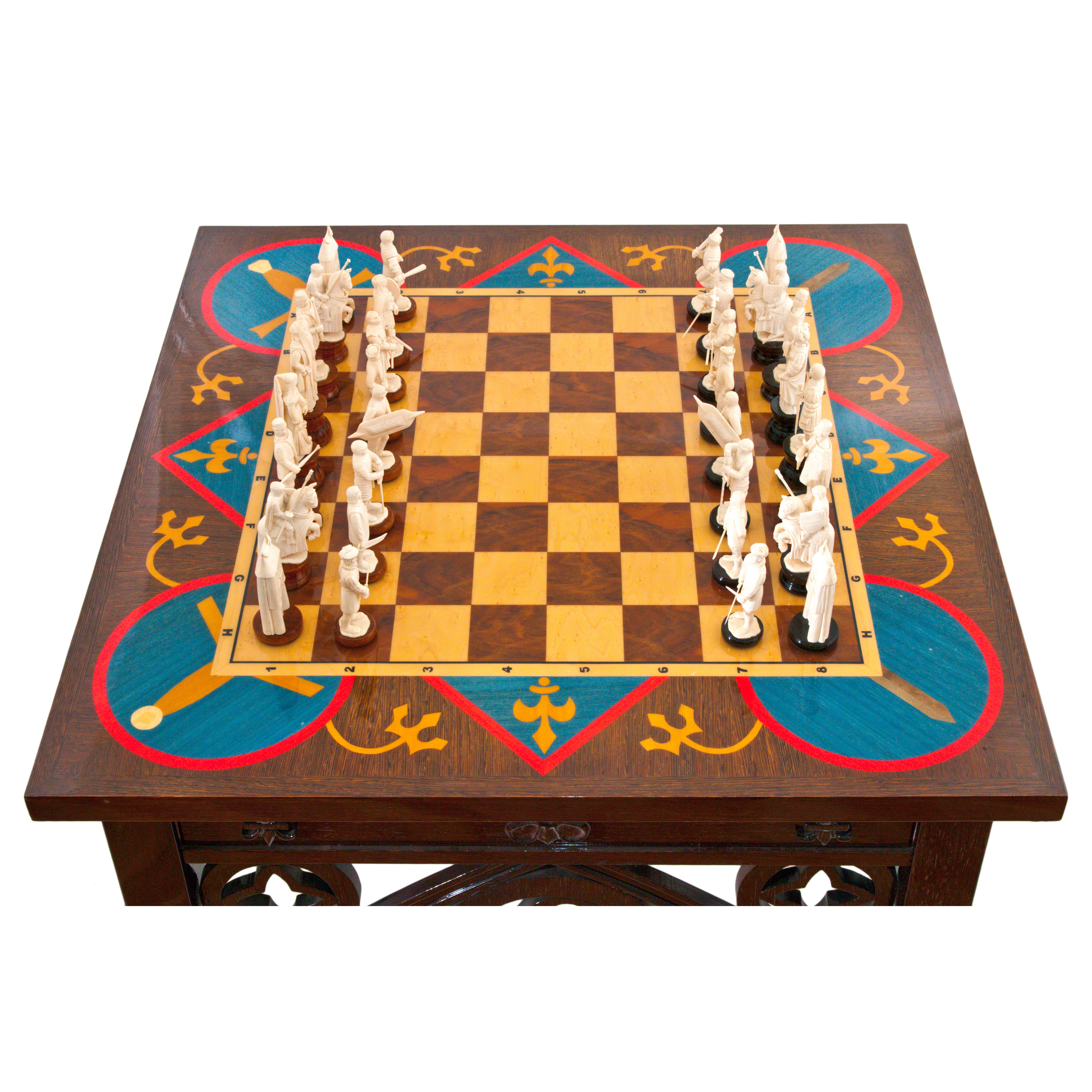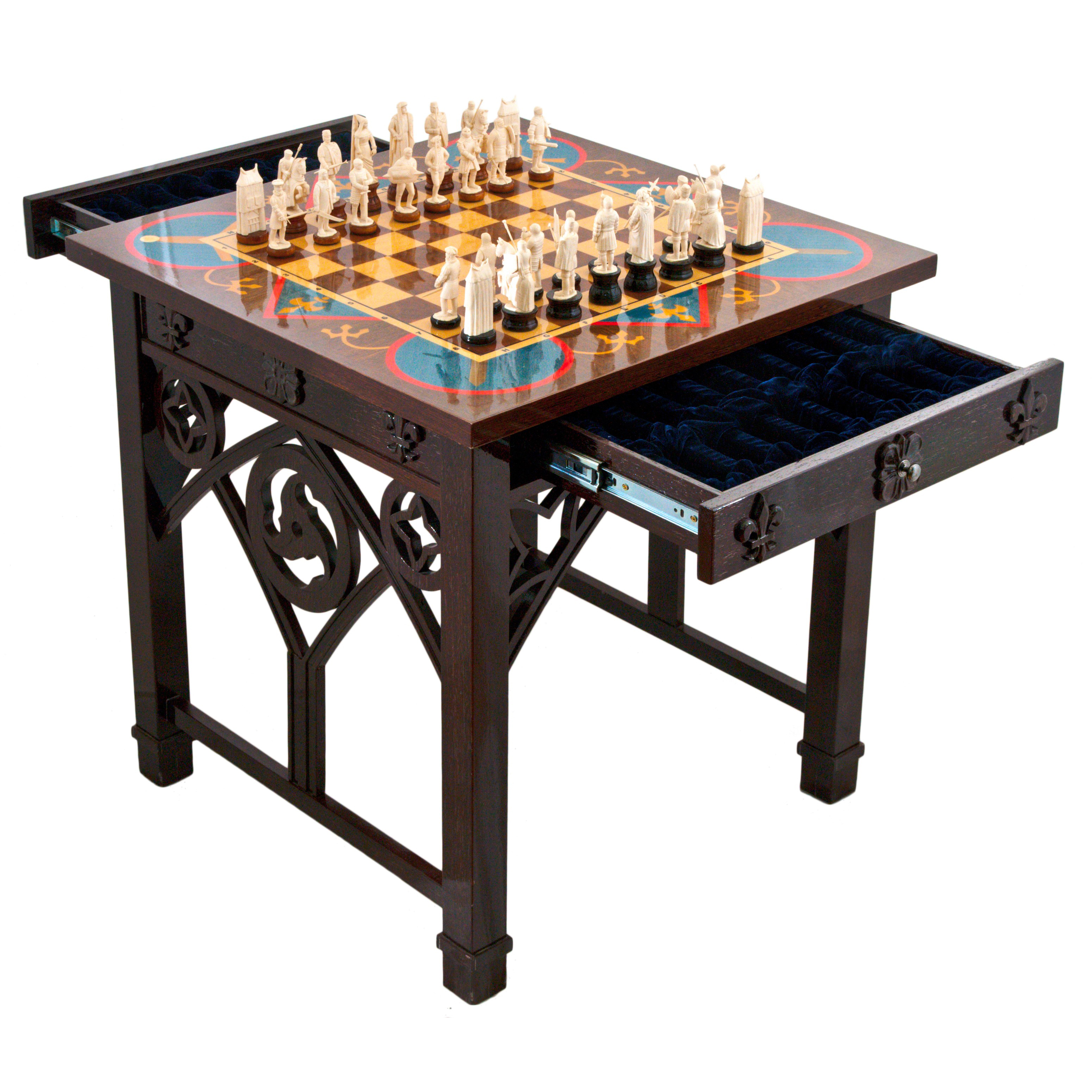 Этот стол — не просто предмет мебели, а произведение искусства, рассказывающее историю средневекового величия и куртуазной эпохи. В нём сочетаются готическая строгость и аристократическая изысканность, объединяя в себе силу рыцарской эпохи и мастерство современных художников. Каждая партия, сыгранная на этом столе, — это настоящее путешествие в мир древних замков, турнирных залов и блестящих доспехов, где каждый ход полон значимости и скрытого смысла.