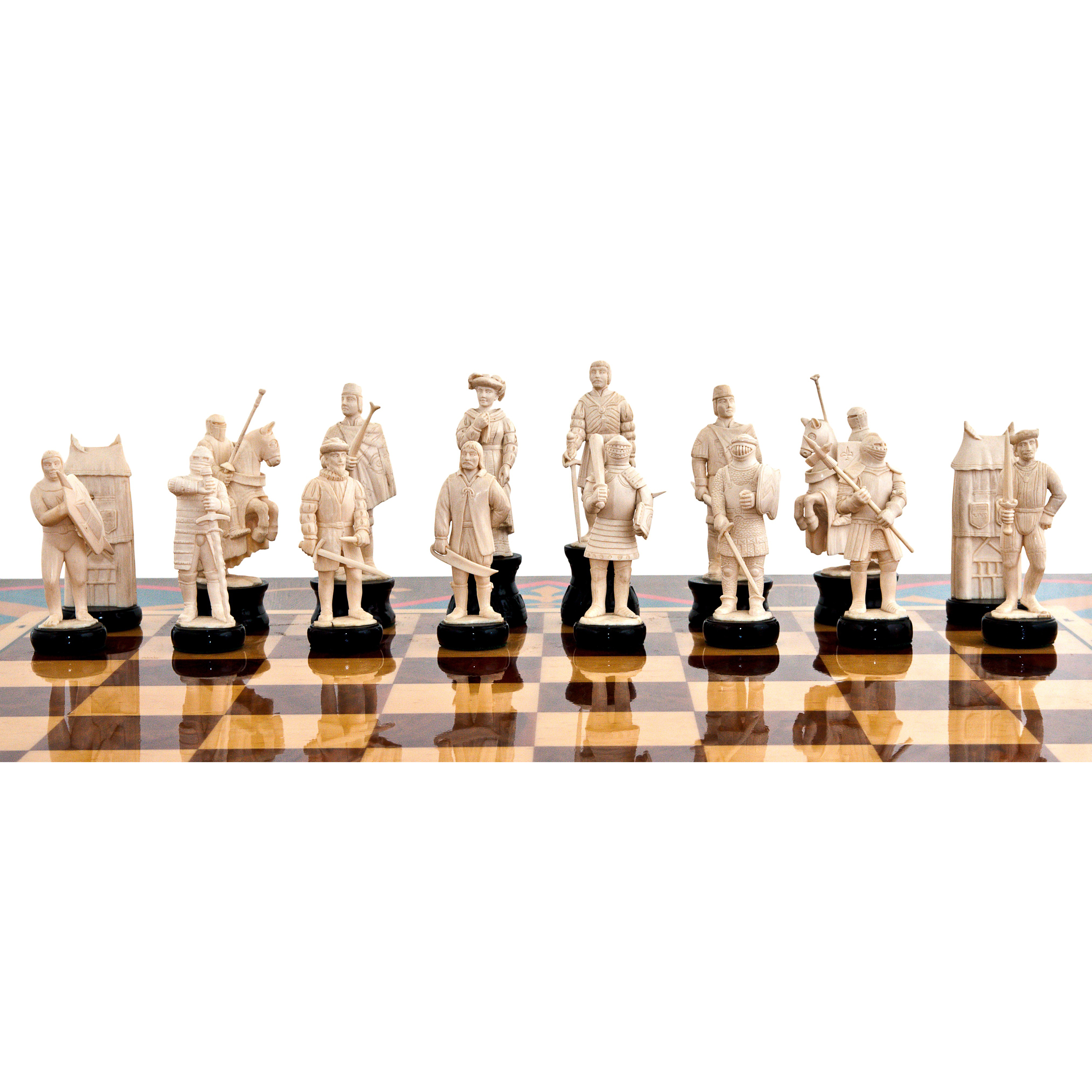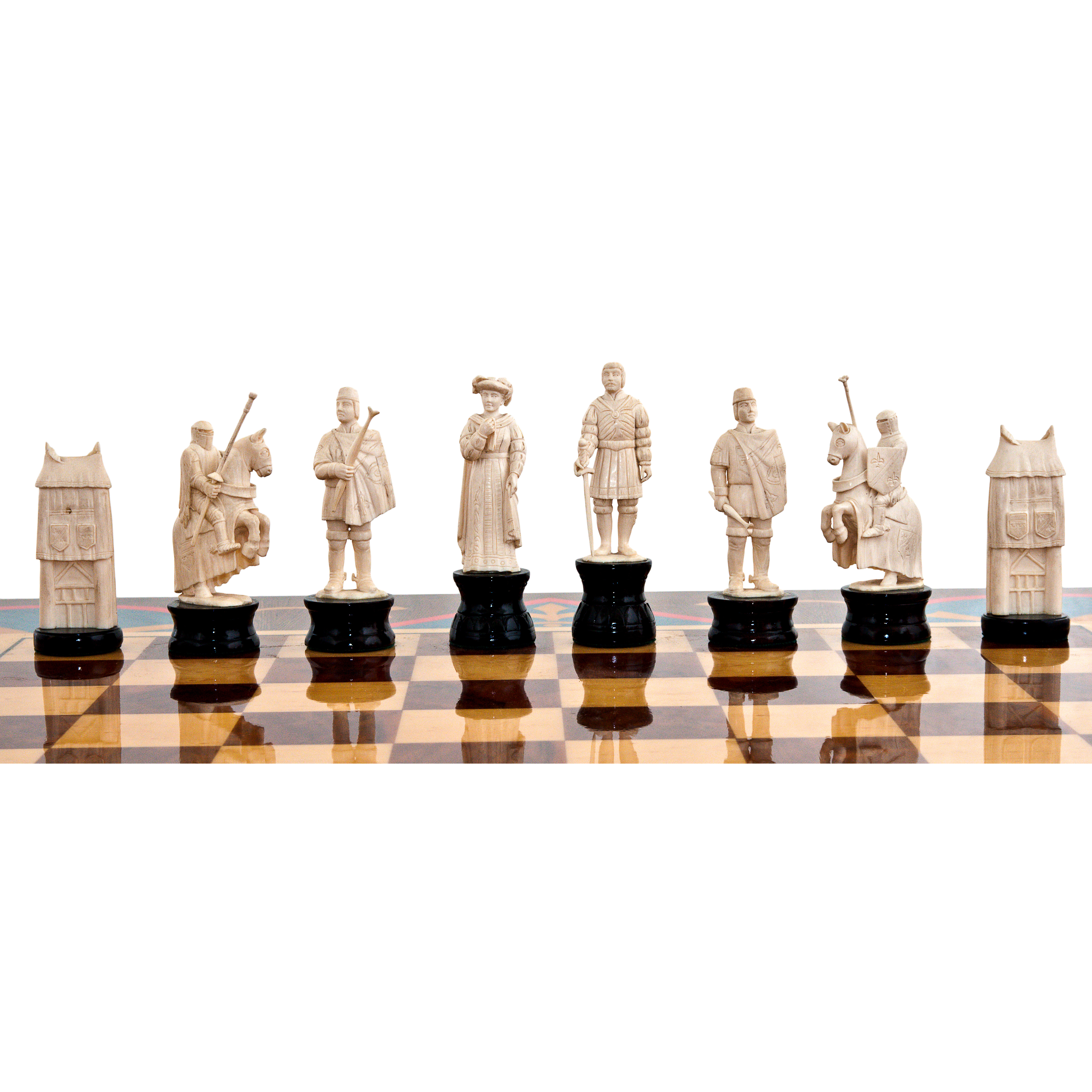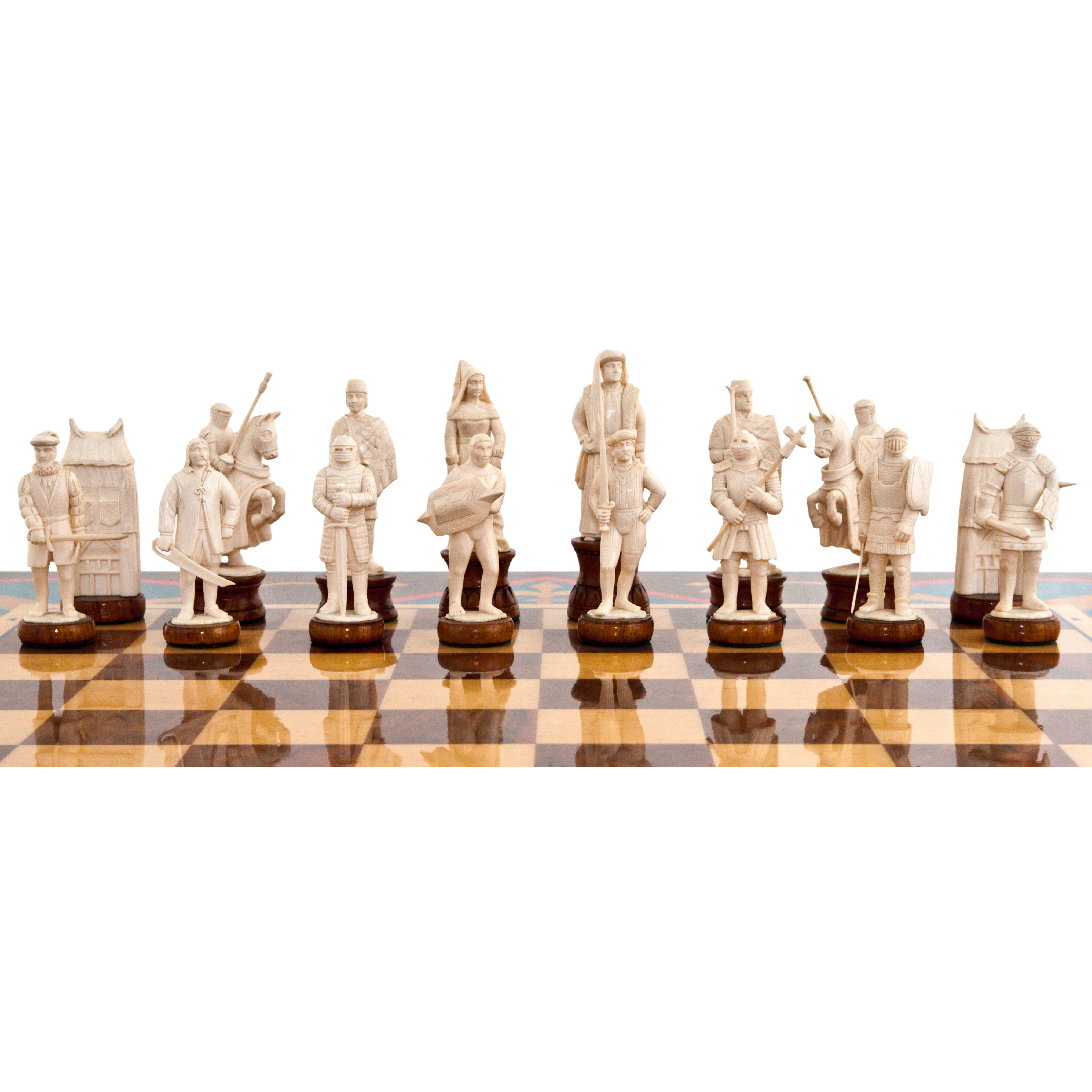 Шахматное поле, набранное из шпона ореха и сахарного клёна, словно приглашает к игре, где каждый ход становится частью стратегической дуэли, в которой победа достигается не только силой, но и умом. Темные и светлые квадраты шахматной доски, как символы вечной борьбы света и тьмы, указывают на безмолвную войну, разворачивающуюся на поле. Здесь шахматы становятся метафорой битвы, в которой честь и достоинство определяют судьбы королей.