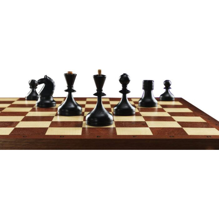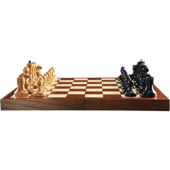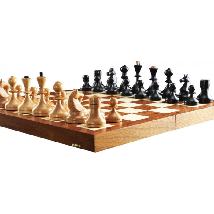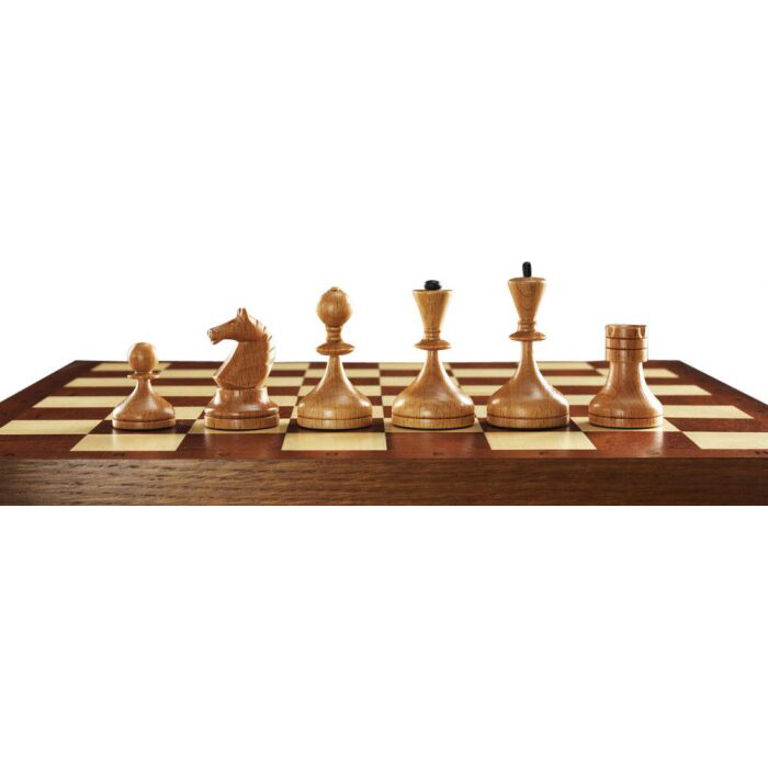 Материалы:фигуры светлые - ясень или бук, матовый лак; фигуры темные - тонированный ясень или бук, матовый лак; все с утяжелением, основания подклеены замшей. Шахматное поле - матовый лак; клетка светлая - клен; клетка темная - сапеле; буквы - клен; корпус - массив дуба тонированный, конструкция складной доски на петлях и замочках, внутри место для фигур оклеено тканью.