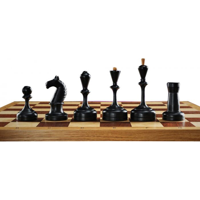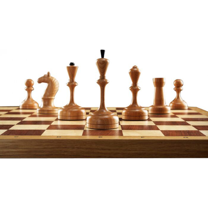 Материалы:фигуры светлые - ясень, матовый лак; фигуры темные - тонированный ясень, матовый лак; все с утяжелением, основания подклеены замшей. Шахматное поле - матовый лак; клетка светлая - сапеле; клетка темная - клен; буквы - клен; корпус - массив дуба.