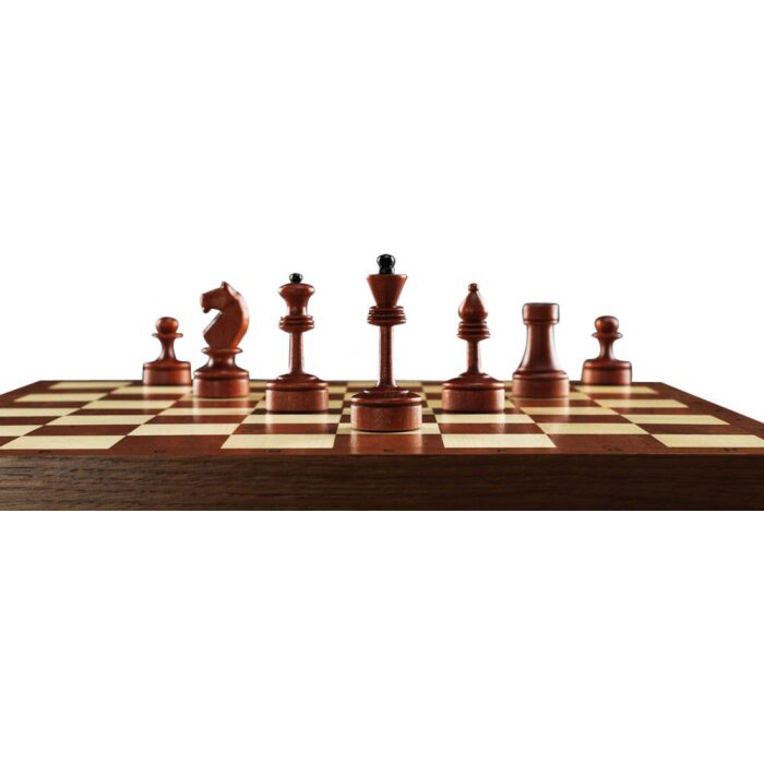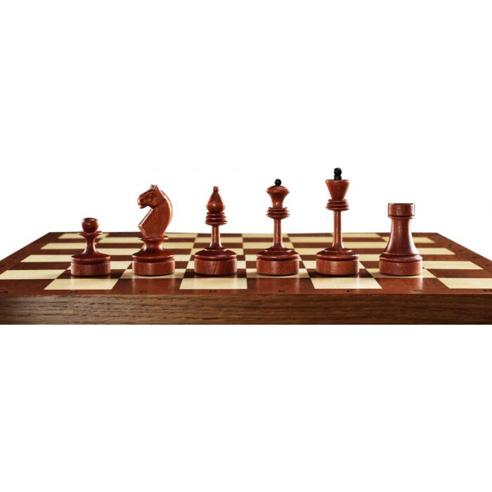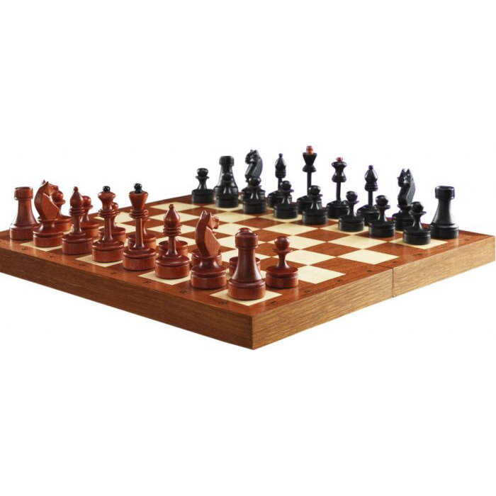 Материалы:фигуры светлые - клен тонировка, матовый лак; фигуры темные - клен тонировка, матовый лак; все с утяжелением, основания подклеены замшей. Шахматное поле - матовый лак; клетка светлая - клен; клетка темная - сапеле; буквы - клен; корпус - массив дуба тонированный.