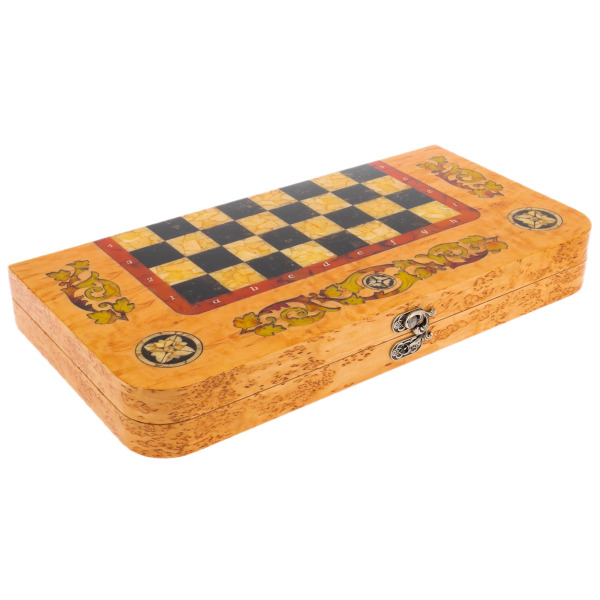 Игровая доска, выполненная из благородной карельской березы, являет собой символ изысканности и природной гармонии. Ее гладкая поверхность, украшенная филигранной инкрустацией из янтаря, словно отражает мерцание северных звезд над тихими водами, напоминая о таинственной красоте скандинавских лесов. Карельская береза, известная своим уникальным узором и светлым оттенком, будто хранит в себе дыхание древних рощ и непреходящее очарование природы.