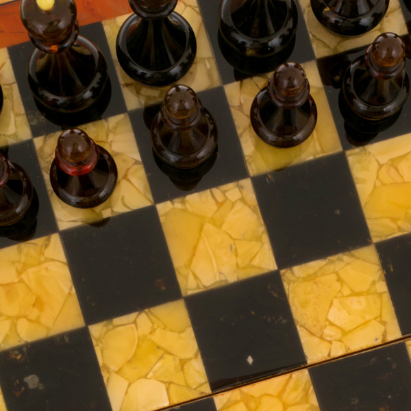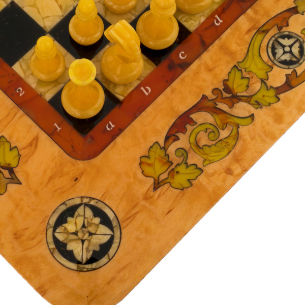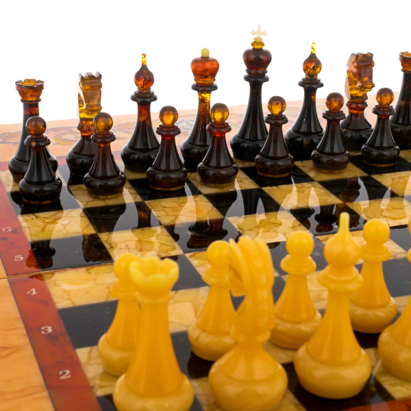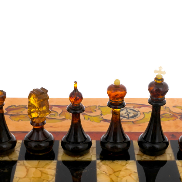 Шахматы из мирта и янтаря "Арабески-Марин"Шахматы из мирта и янтаря "Арабески-Марин"Безупречное качество и эксклюзивный дизайн элитных шахмат не оставят равнодушным истинного ценителя добротных и красивых вещей! Эти шахматы изготавливаются вручную из натурального янтаря в технике «Ковровская мозаика». Текстура материалов неповторима: невозможно изготовить двое совершенно одинаковых шахмат. Для изготовления игровой фурнитуры используется янтарный композит самых разных оттенков.