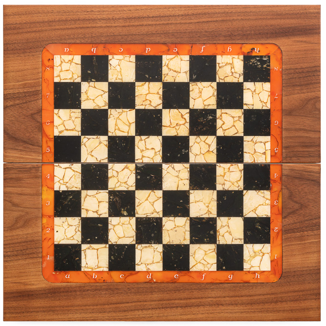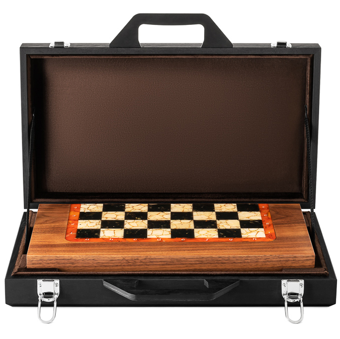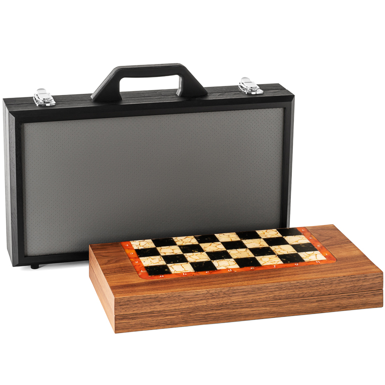 Комплектация:кейс из дерева и ткани ручной работы, доска из ценных пород древесины с натуральным балтийским янтарем.